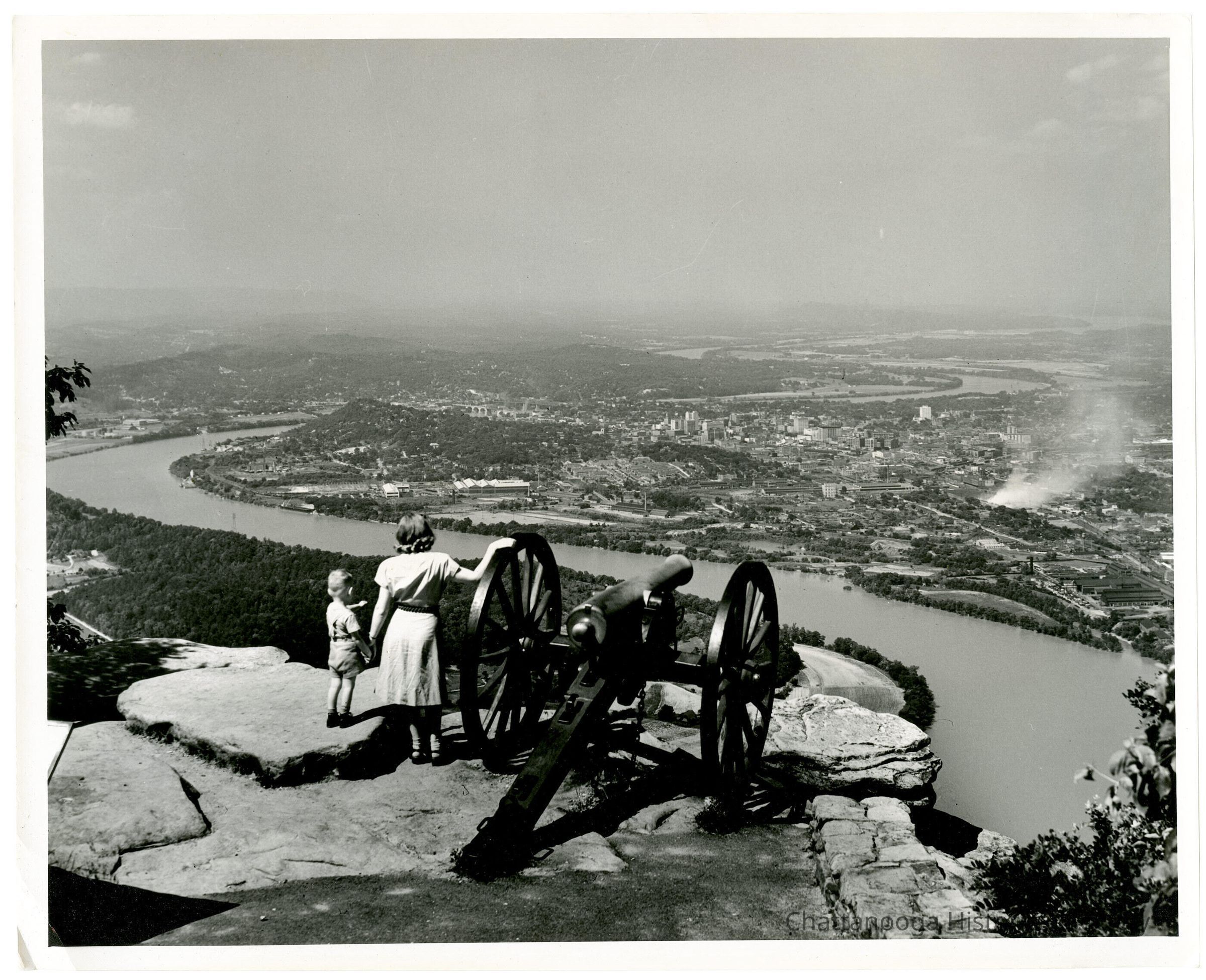 Black and white photograph of a woman and child standing next to a cannon at Lookout Point on Lookout Mountain. The vista shows a view of downtown Chattanooga.