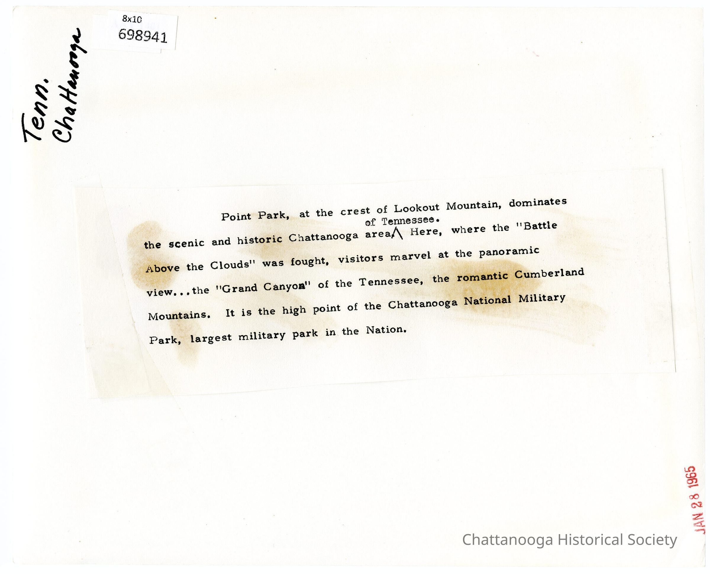 Pasted on the rear, a excerpt reads "Point Park, at the crest of Lookout Mountain, dominates the scenic and historic Chattanooga area ^of Tennessee. Here, where the "Battle Above the Clouds" was fought, visitors marvel at the panoramic view....the "Grand Canyon" of the Tennessee, the romantic Cumberland Mountains. It is the high point of the Chattanooga National Military Park, the largest military park in the nation."