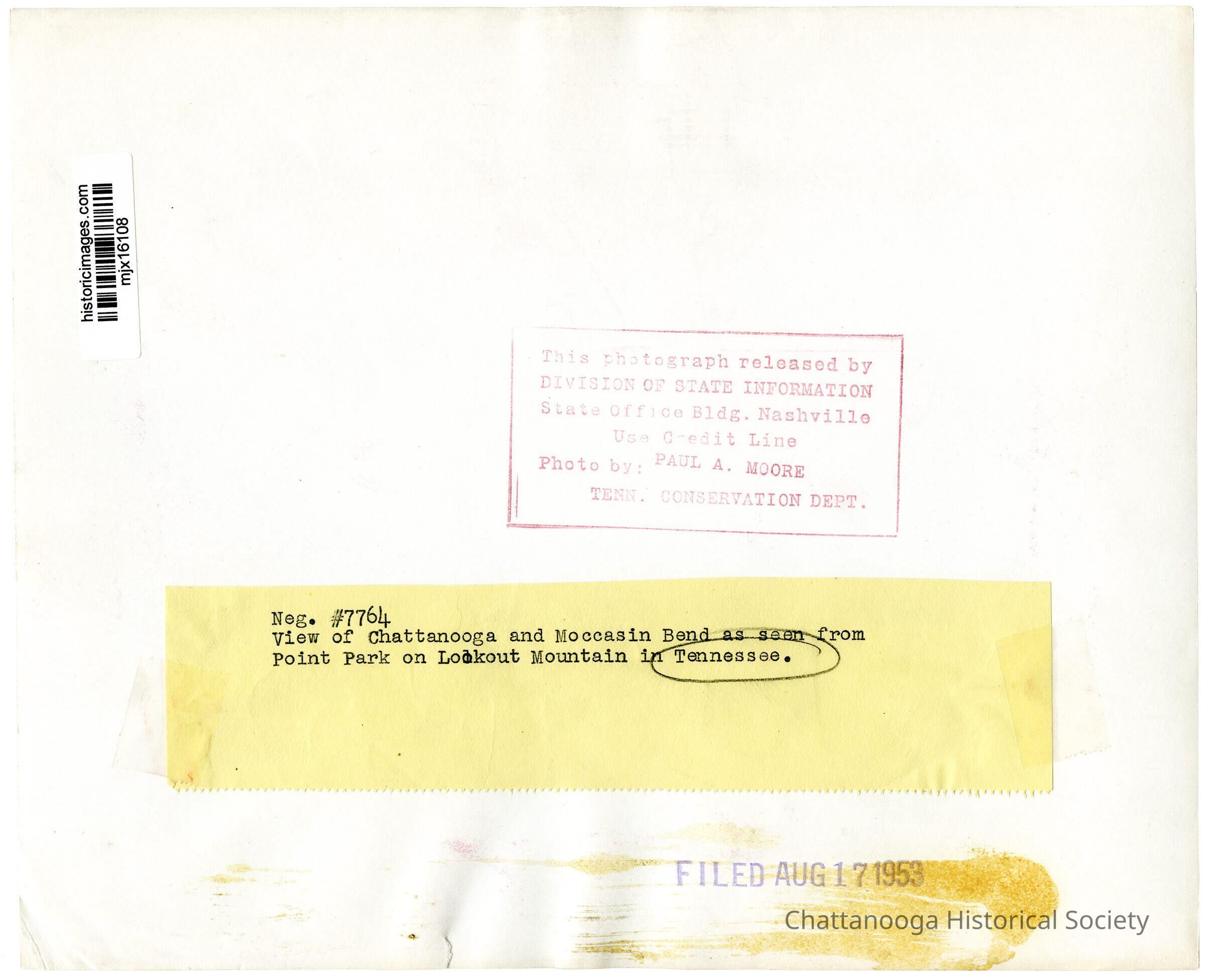 below a yellow slip of paper has been taped to the rear which reads "Neg. 7764 View of Chattanooga and Moccasin Bend as seen from Point Park on Lookout Mountain in Tennessee."