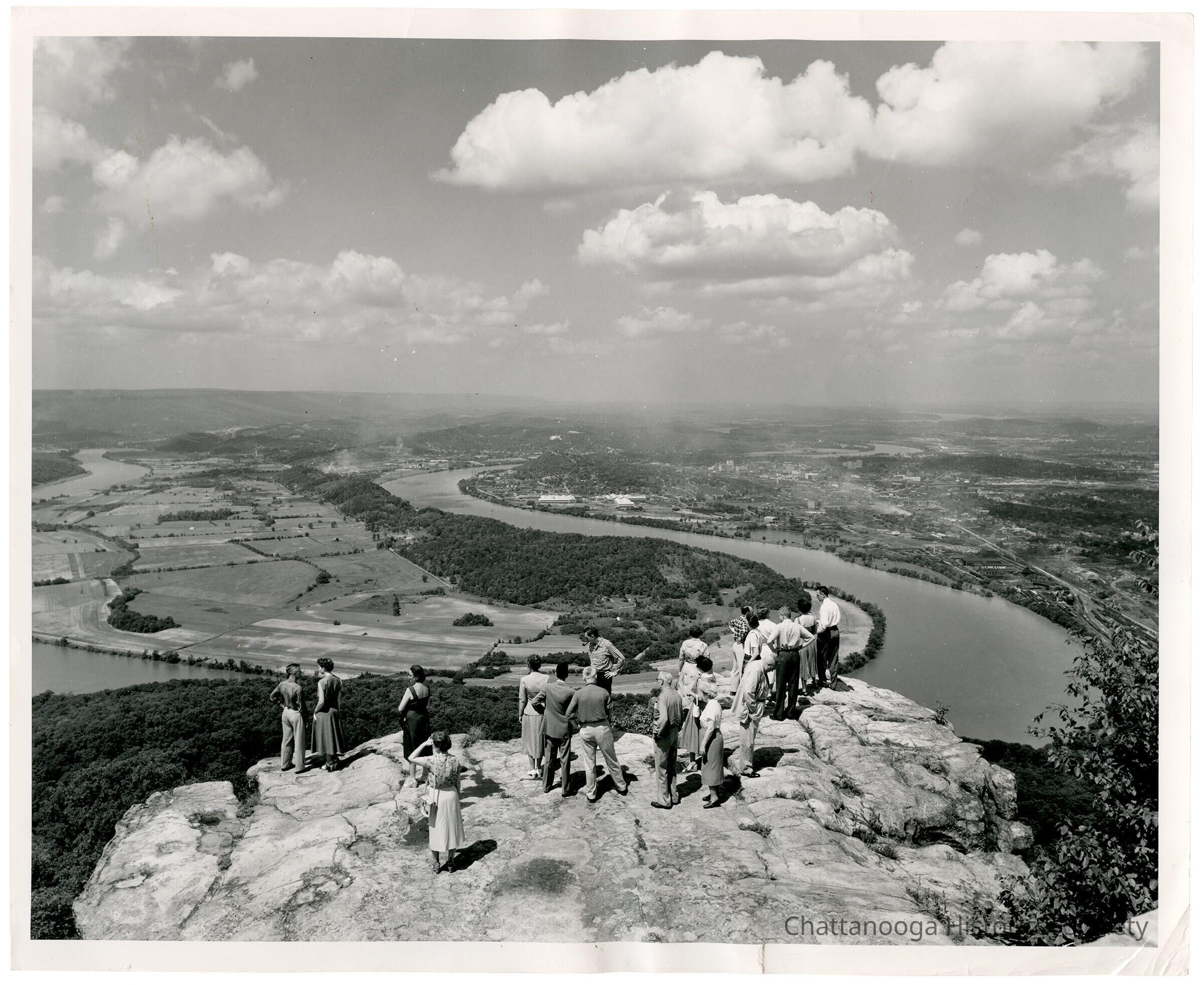 A photograph showing a group of tourists on Lookout Point overlooking the City of Chattanooga, and Moccasin Bend.
