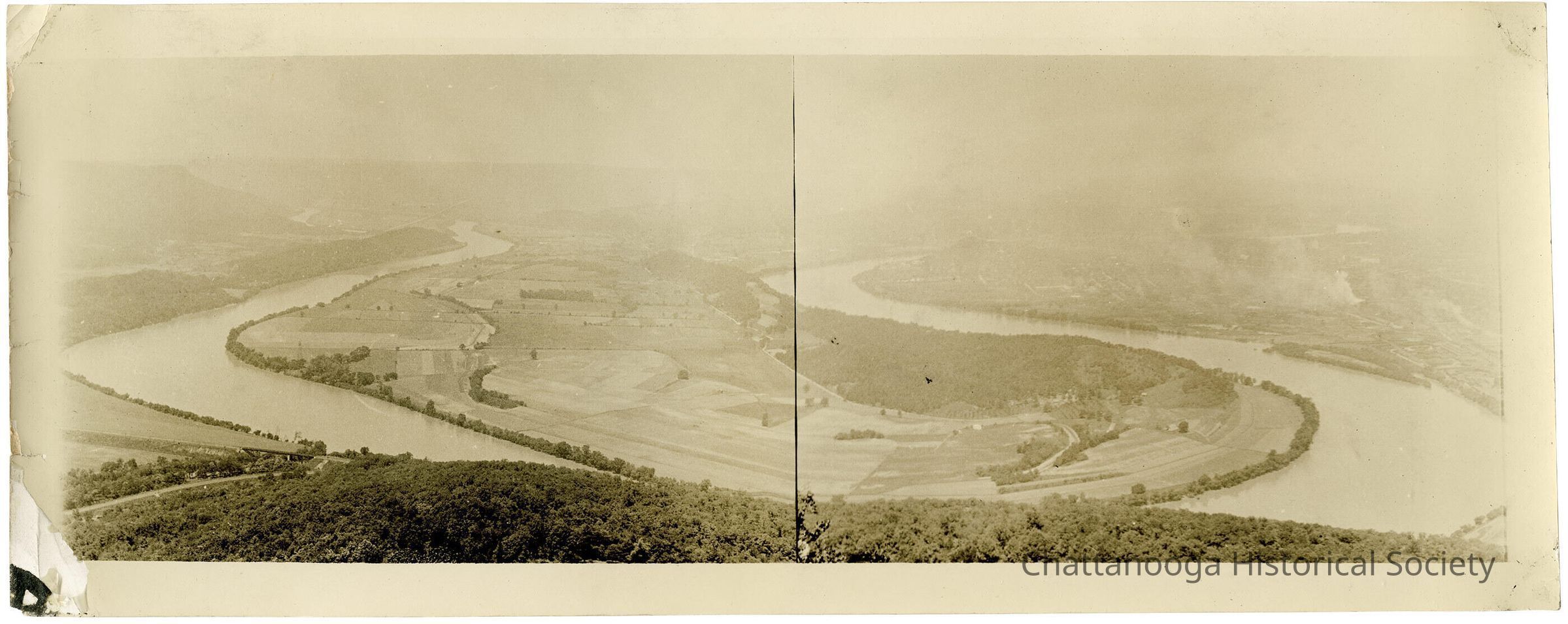 A panoramic photograph of the Moccasin Bend of the Tennessee River, as seen from Lookout Point on Lookout Mountain, Tennessee.Photograph Details