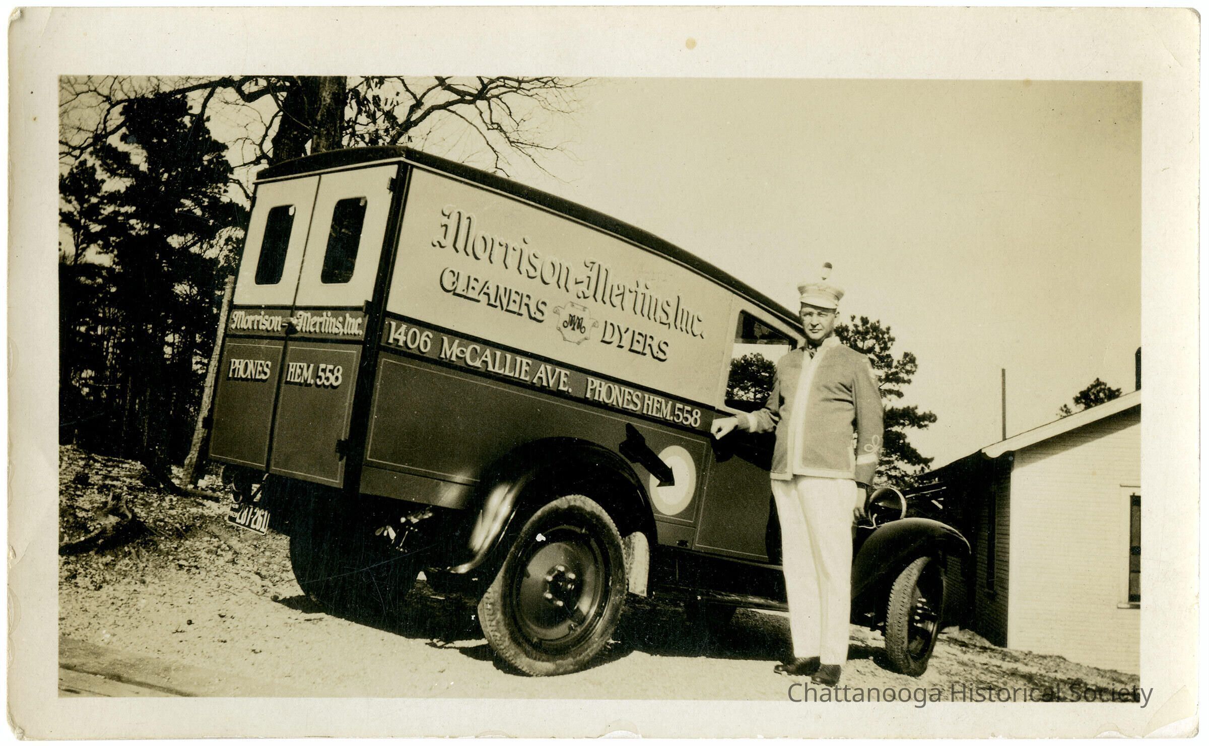 A black and white photograph of a man in uniform standing next to a delivery truck belonging to Morrison-Mertins, Inc. Cleaners and Dyers. The photograph shows a two tone delivery vehicle with the name of the company painted on the side along with a cartouche with a double-M at the center, in between "Cleaners" and "Dyers". At the center is a stripe reading "1406 McCallie Ave. Phones Hem. 558". The rear of the truck has double doors with the name Morrison-Mertins, Inc." at center and "Phones Hem. 558" below. The license plate reads 1929 287-261"