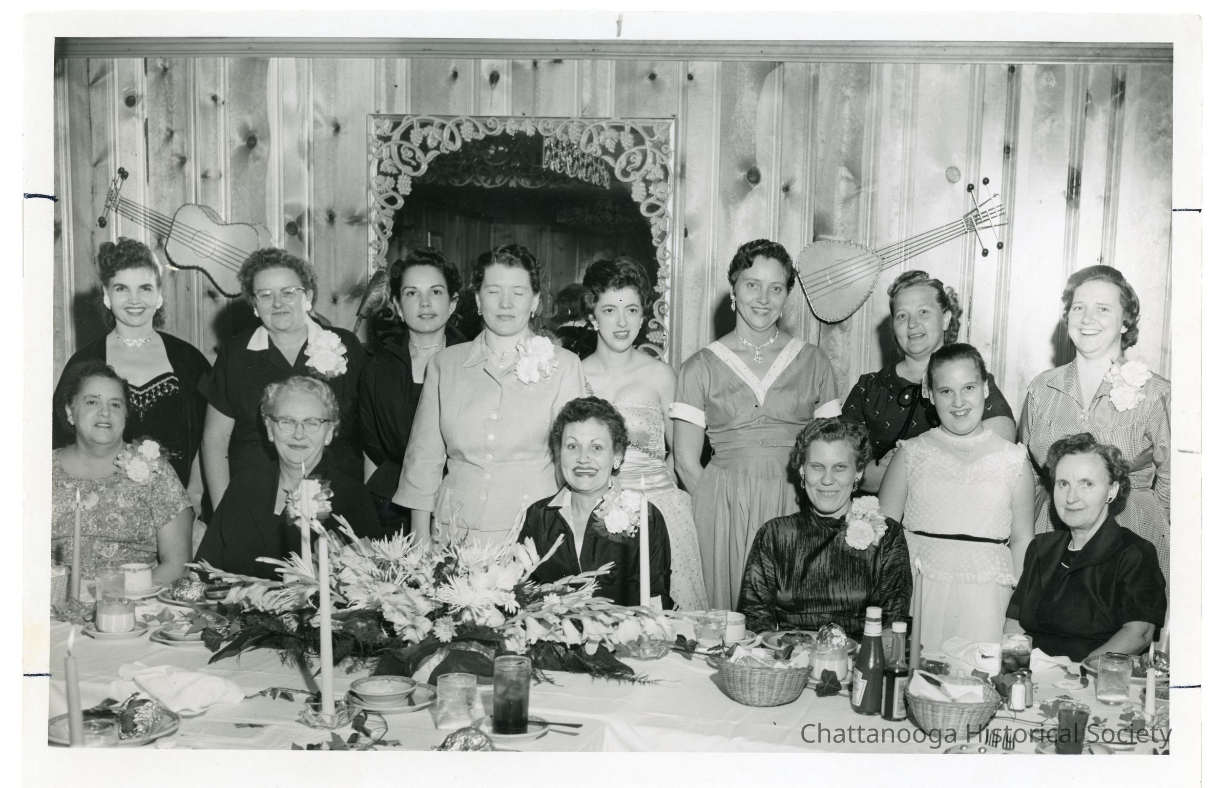 A black and white photograph of a group of women at the Mt. Vernon Colonial Restaurant in Chattanooga. The photograph shows two rows of women standing and seated behind a table set for dinner. There are eight women standing in the back row with five women seated and a young girl standing in front of them. The table features a large floral arrangement and is set for a dinner service, with baskets of bread on the table as well as dinner dishes. The women are posing with a wood paneled wall and a decorative mirror behind them with two guitar-lights on the wall flanking a decorative mirror.