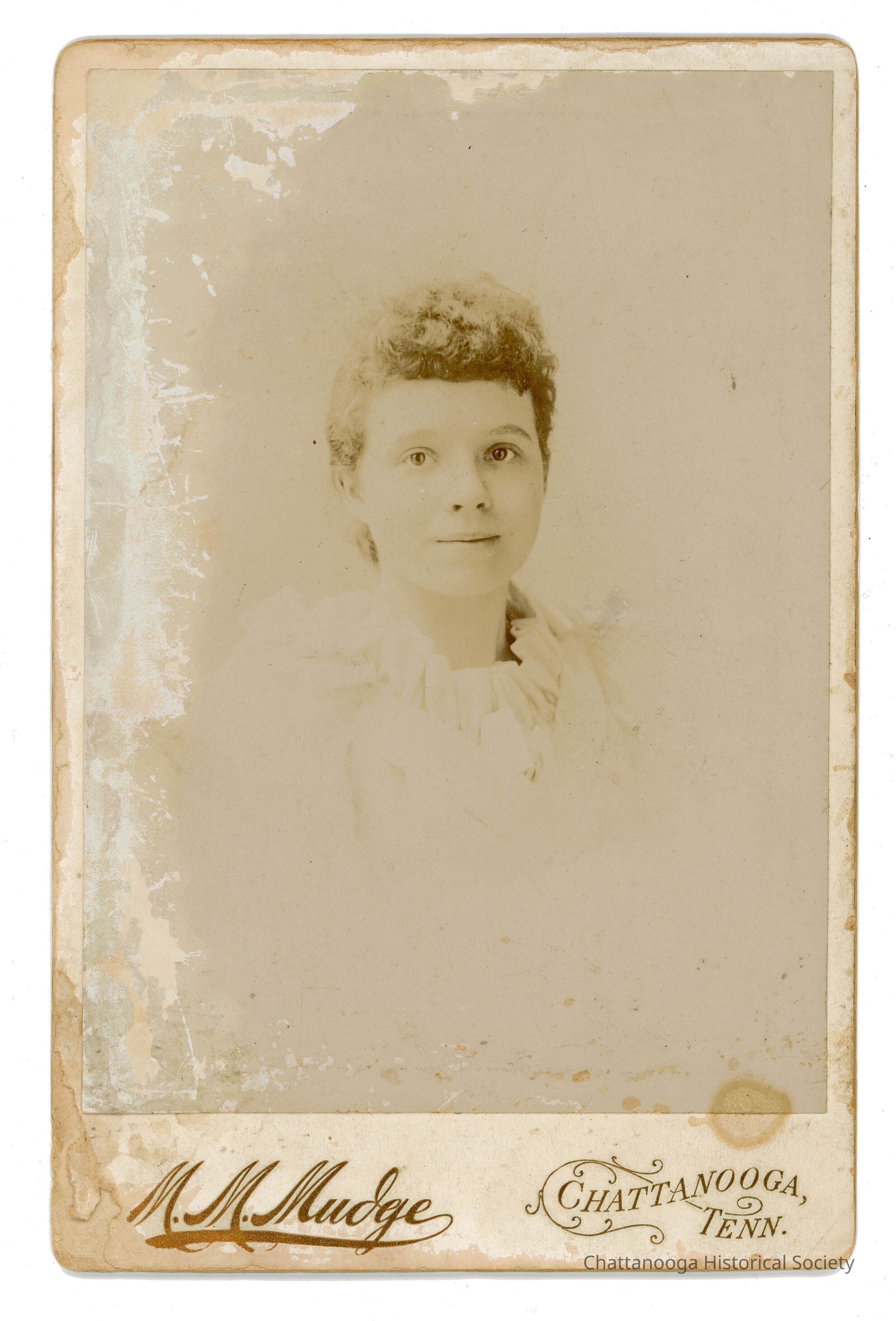 A black and white portrait of an unknown woman mounted on a cabinet card by M. M. Mudge. The portrait shows a young woman with short, curled bangs and a light colored blouse with a lacy collar. The photograph is labeled "M. M. Mudge Chattanooga | Tenn." in the bottom gutter of the card.Photograph Details