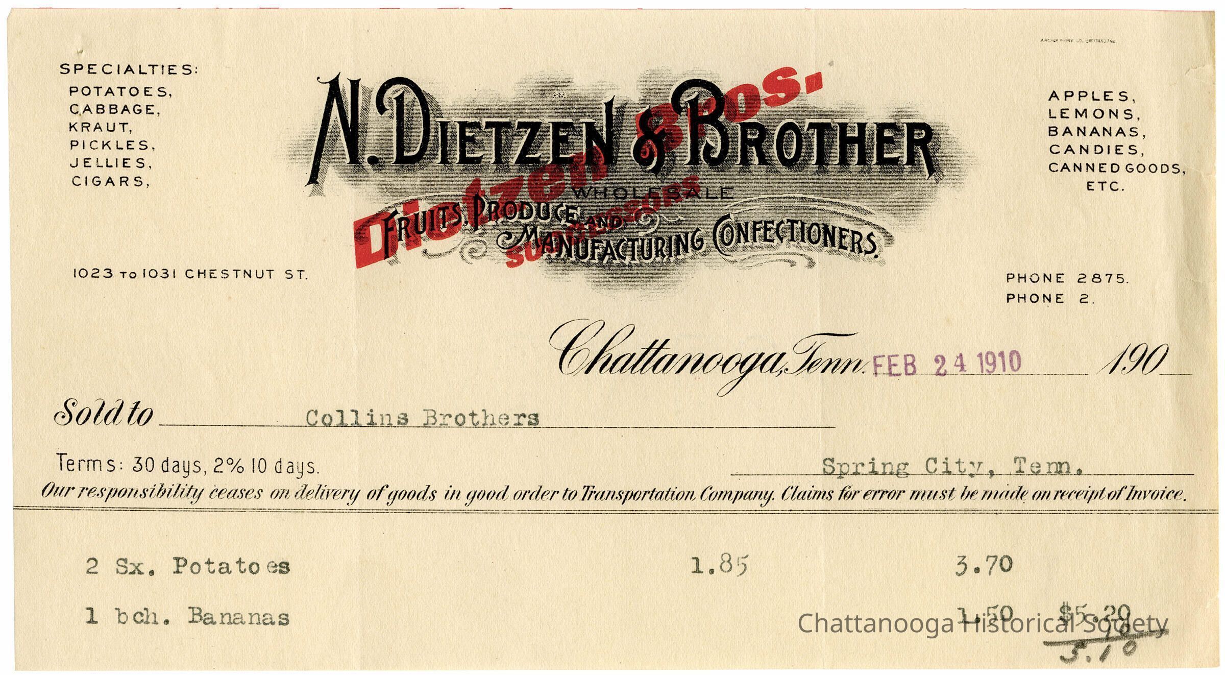 A receipt from N. Dietzen & Brother Wholesale Fruits, Produce and Manufacturing Confectioners for sale of potatoes and bananas to Collins Brothers.