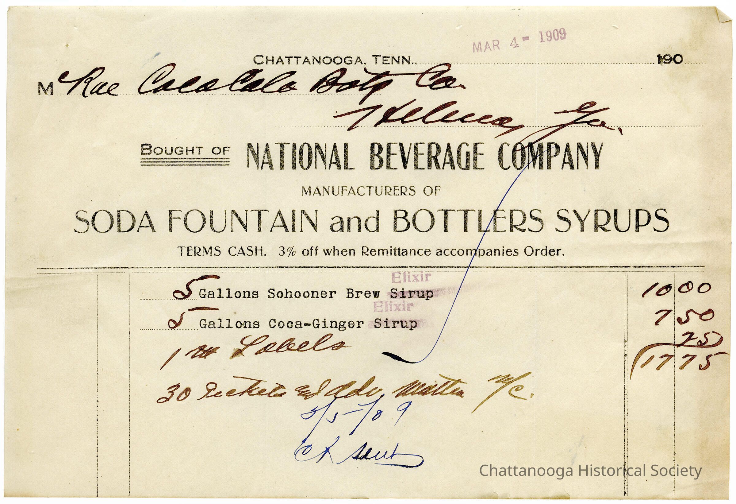 A receipt from the National Beverage Company for the sale of "sirup" and labels to McRae Coca-Cola Bottling Company.