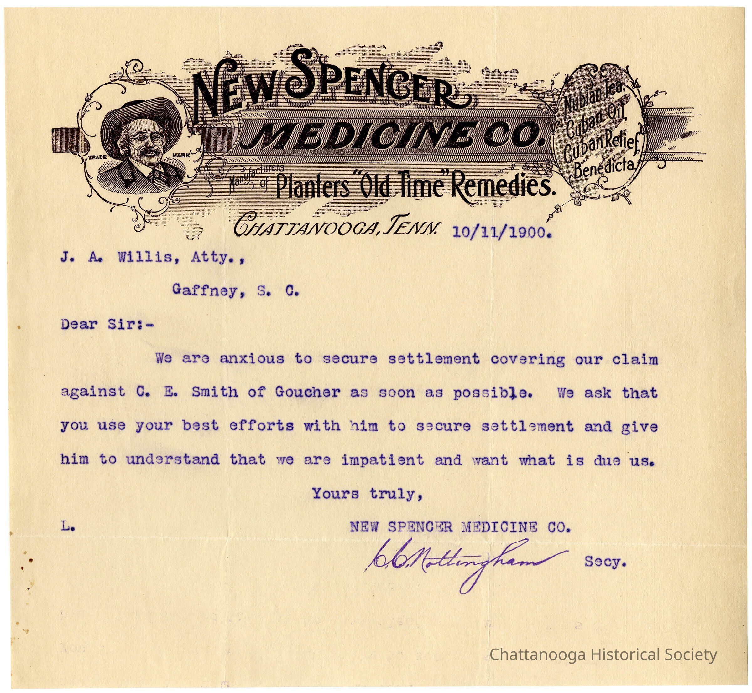 Correspondence from the New Spencer Medicine Company to J. A. Willis, Atty., of Gaffney, South Carolina, seeks an outstanding balance from C. E. Smith.