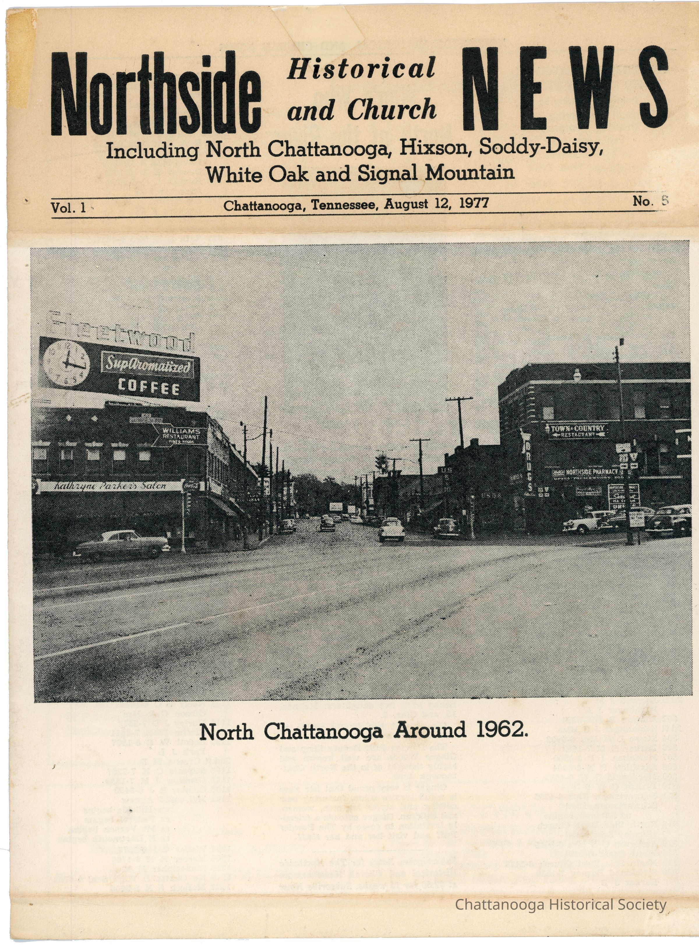 A church newsletter printed with black and white photographs from the North Side ?Church. The front page features a photograph of Frazier Street, North Chattanooga that is titled "North Chattanooga Around 1962." The Fleetwood Coffee sign is at left as well as signs for businesses like "Kathryne Parkers Salon", "Williams Restaurant", "Town Country Restaurant", and "Northside Pharmacy".