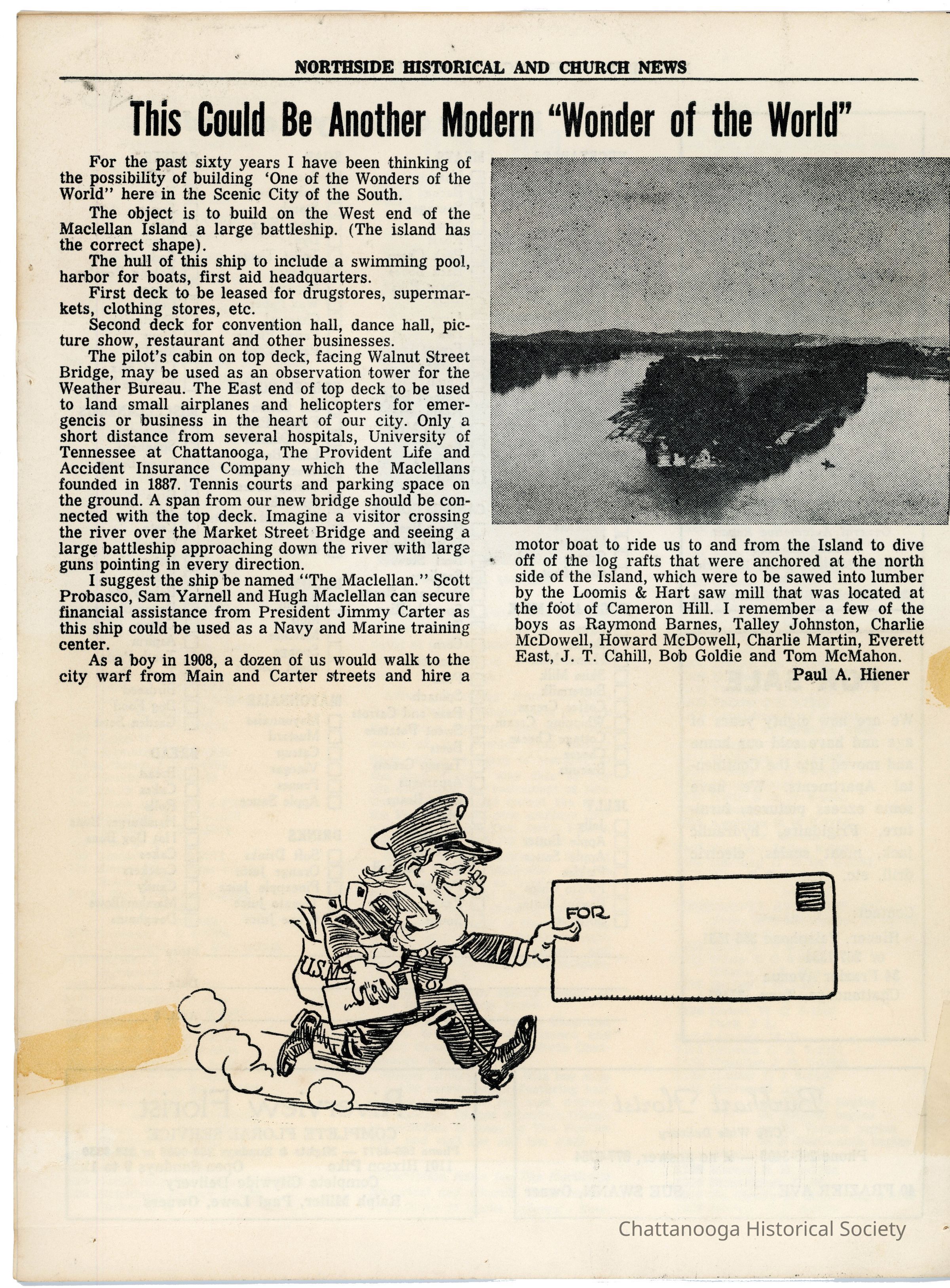 The verso of the newsletter features an article above the fold as well as a graphic of a bearded mailman. The article, written by the editor Paul Heiner, considers the possibility of turning Maclellan Islan into a large Battleship, which would feature an observation deck where small airplanes or helicopters could land, a hull with a swimming pool, harbor for boats, and first aid headquarters, drug stores, supermarkets, etc.Collection