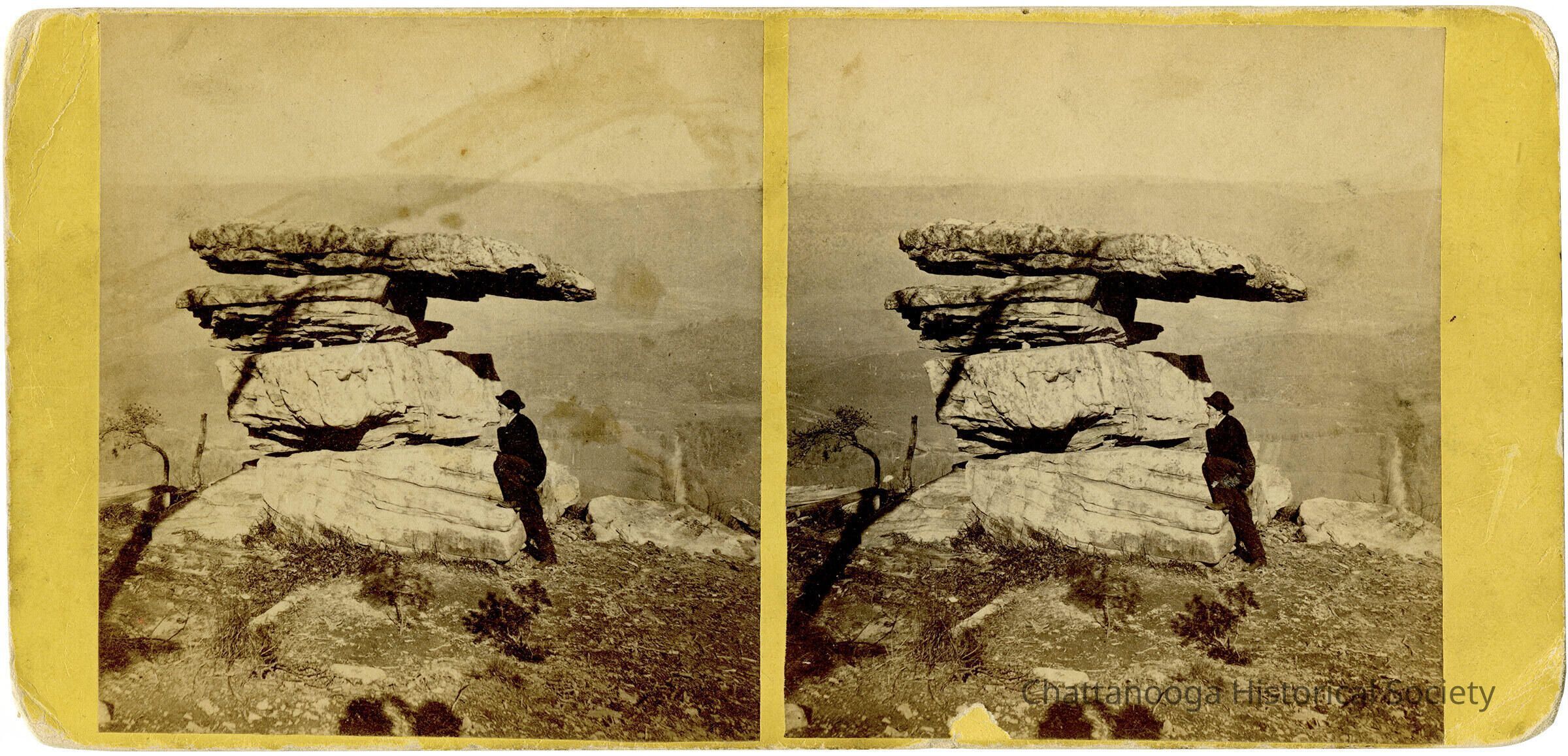 A stereographic view of Umbrella Rock on Lookout Mountain, Tennessee on yellow carding. The photograph features the rock formation at center with a man in a dark suit with one booted foot on the base of the rocks. The rear reads "Noah's Umbrella Lookout Mountain, Tenn." The shadow of the photographer and his camera can be seen at bottom, center.Photograph Details