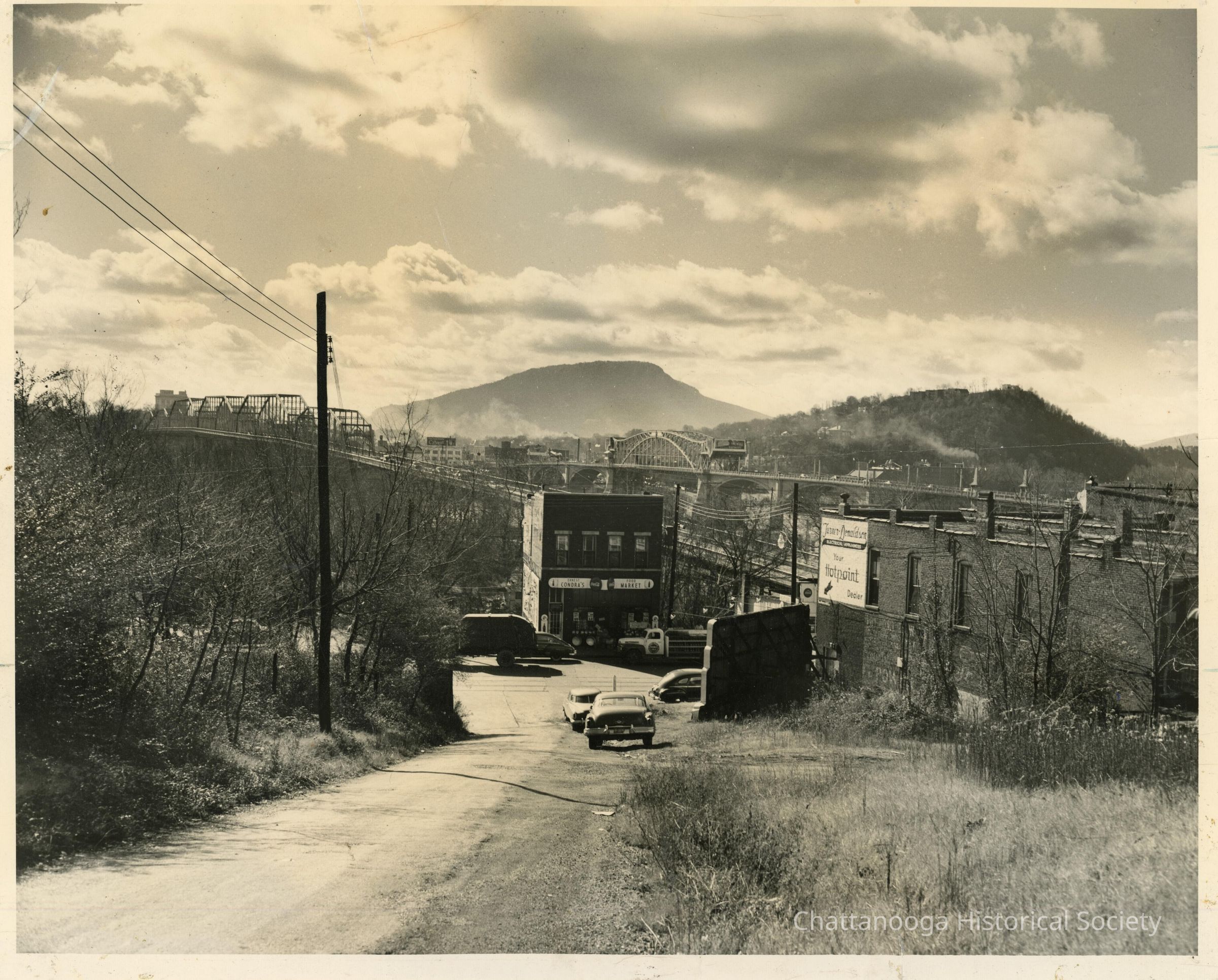 A painted sign on the side of the building across the street reads "Turner-Donaldson Electrical-Appliances. Your Hotpoint Dealer" with an arrow pointing to the street. There is also a billboard beside the building, facing Frazier Street. The Walnut Street and County bridges can be seen in the background, as well as Lookout Mountain and Cameron Hill.
