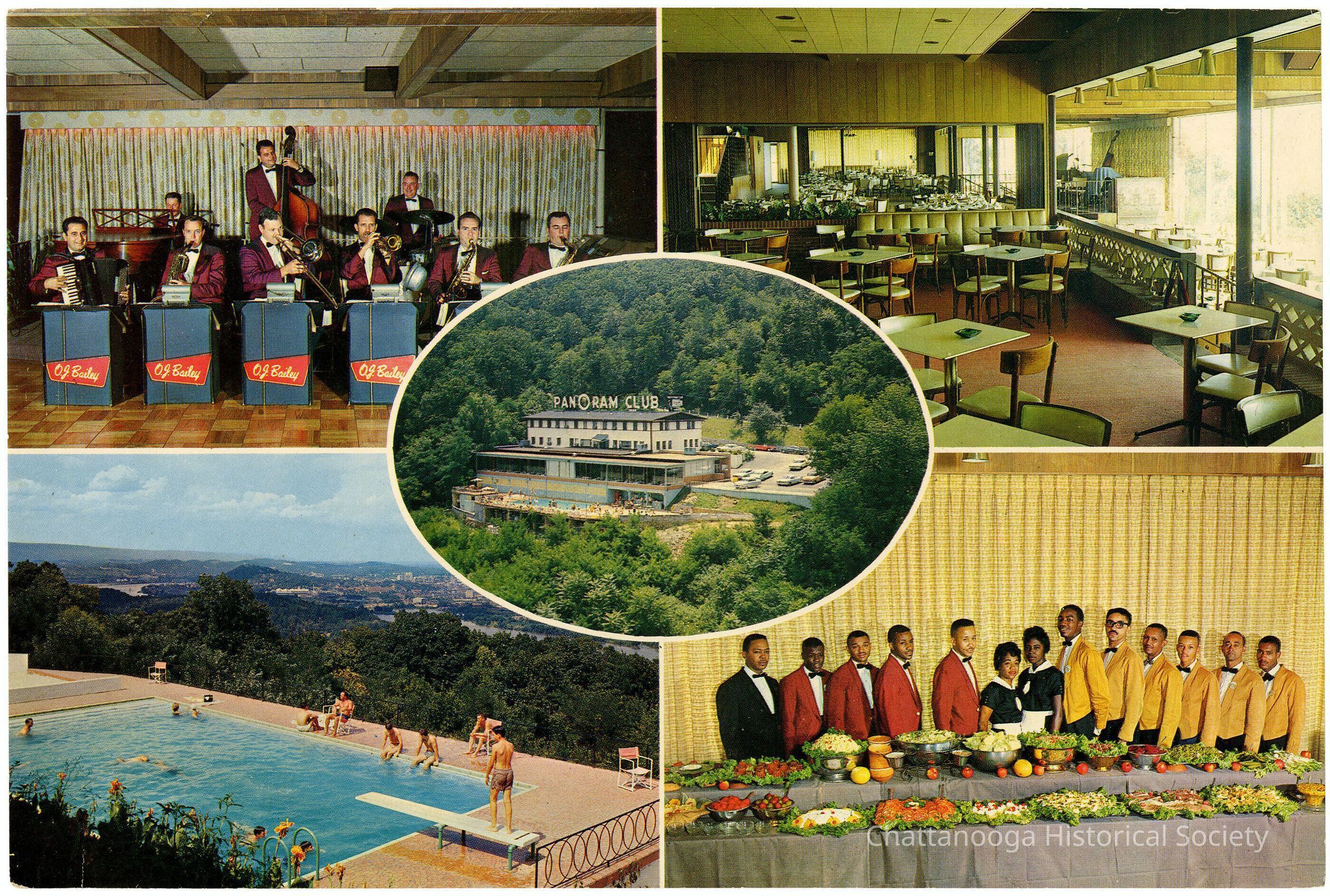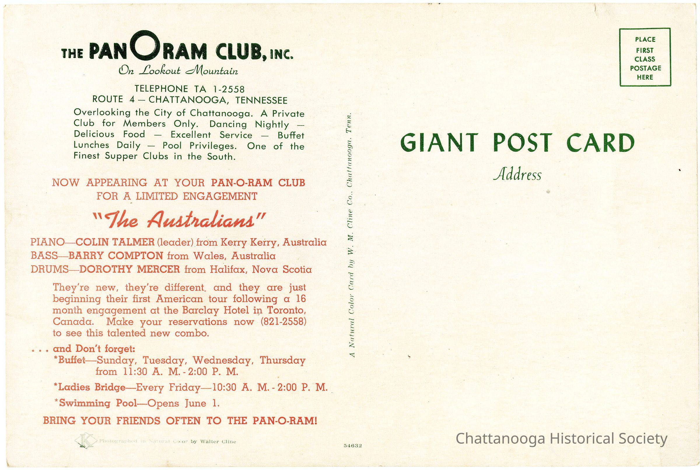 An oversized postcard with the front a collage of photographs of the Pan-O-Ram Club on Lookout Mountain on the front, which includes a circular image of the hotel at the center and photos of the O.J. Bailey band, the dining room, pool, and dining room staff. The back advertises an upcoming performance by "The Australians."