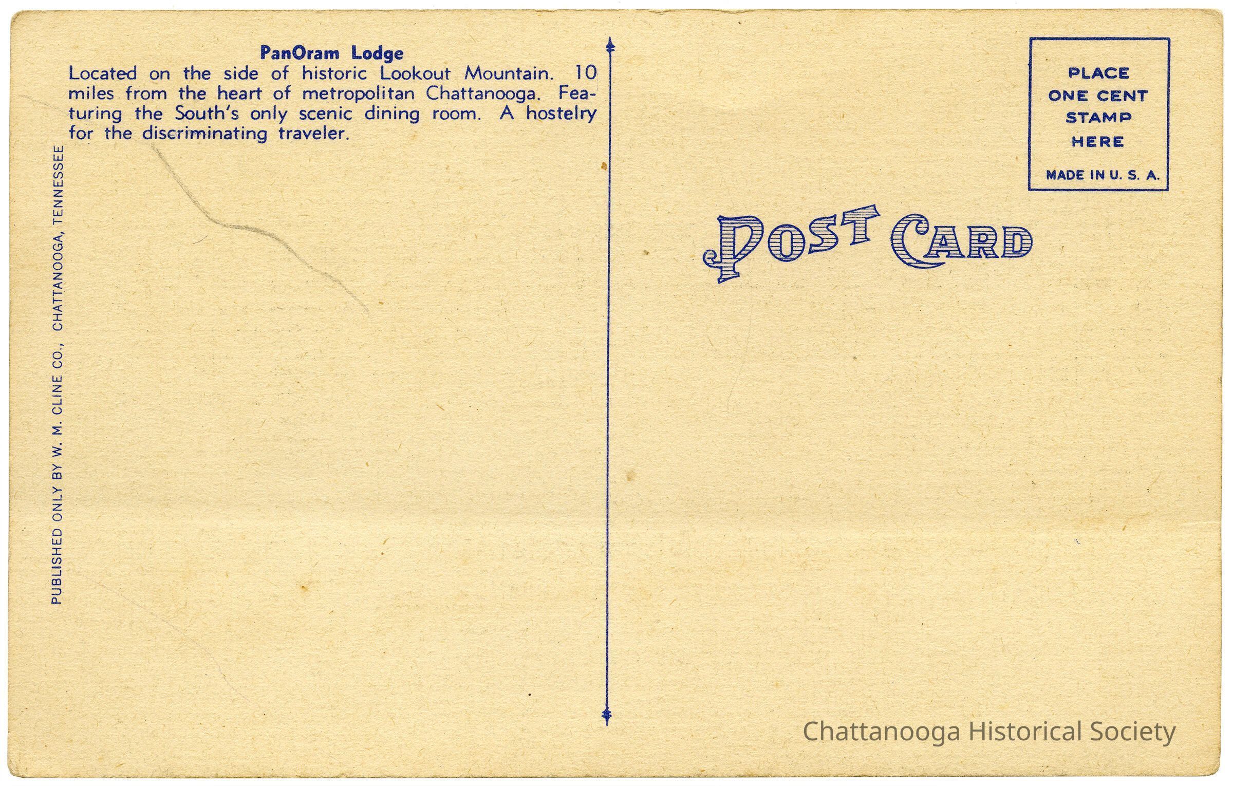 The rear advert text reads "PanOram Lodge Located on the side of historic Lookout Mountain. 10 miles from the heart of metropolitan Chattanooga. Featuring the South's only scenic dining room. A hostelry for the discriminating traveler."Subject Person/Organization