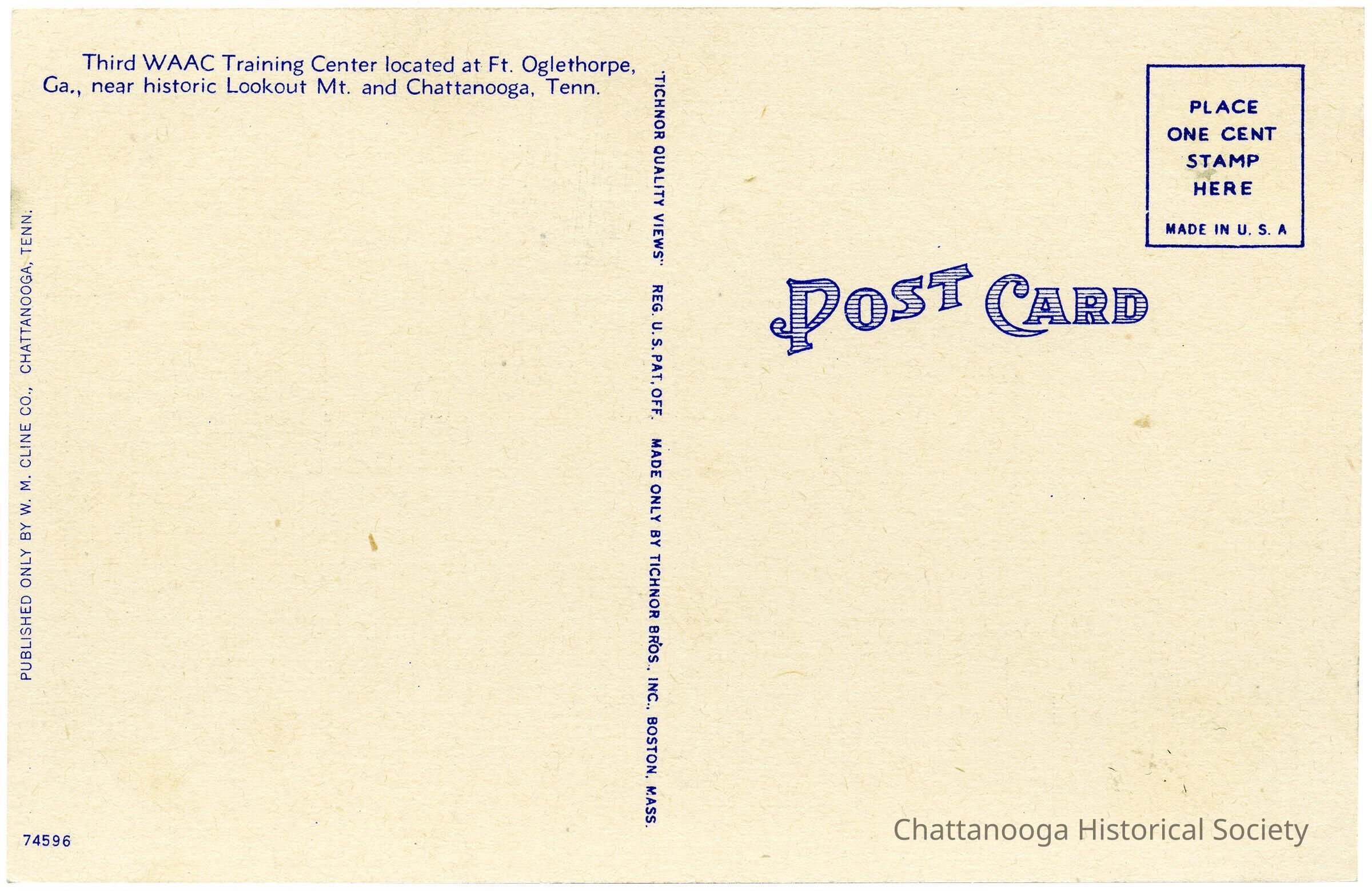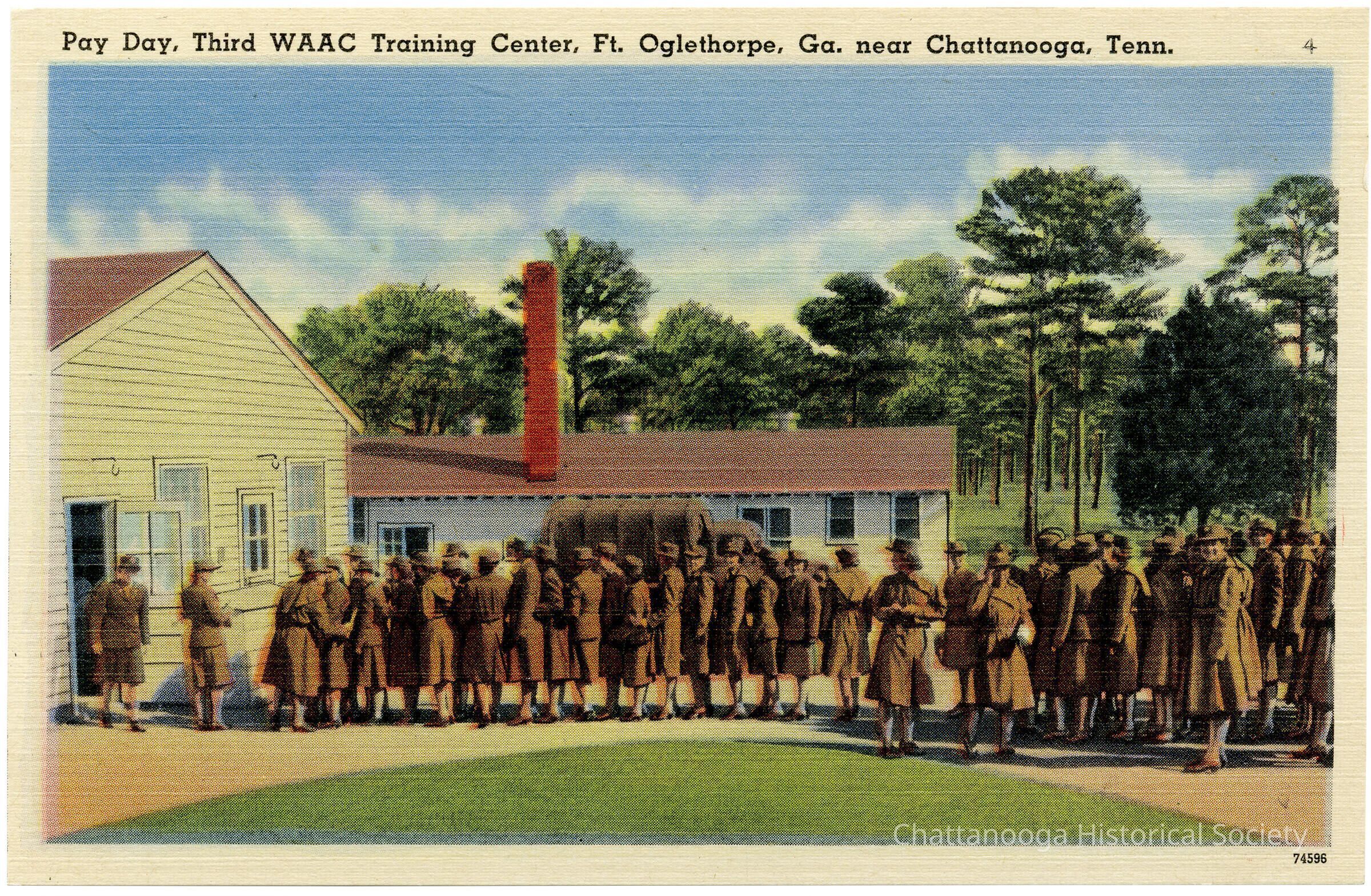 The cholorchrom postcard is labeled "Pay Day, Third WAAC Training Center, Ft. Oglethorpe, Ga. near Chattanooga, Tenn."Subject Person/Organization