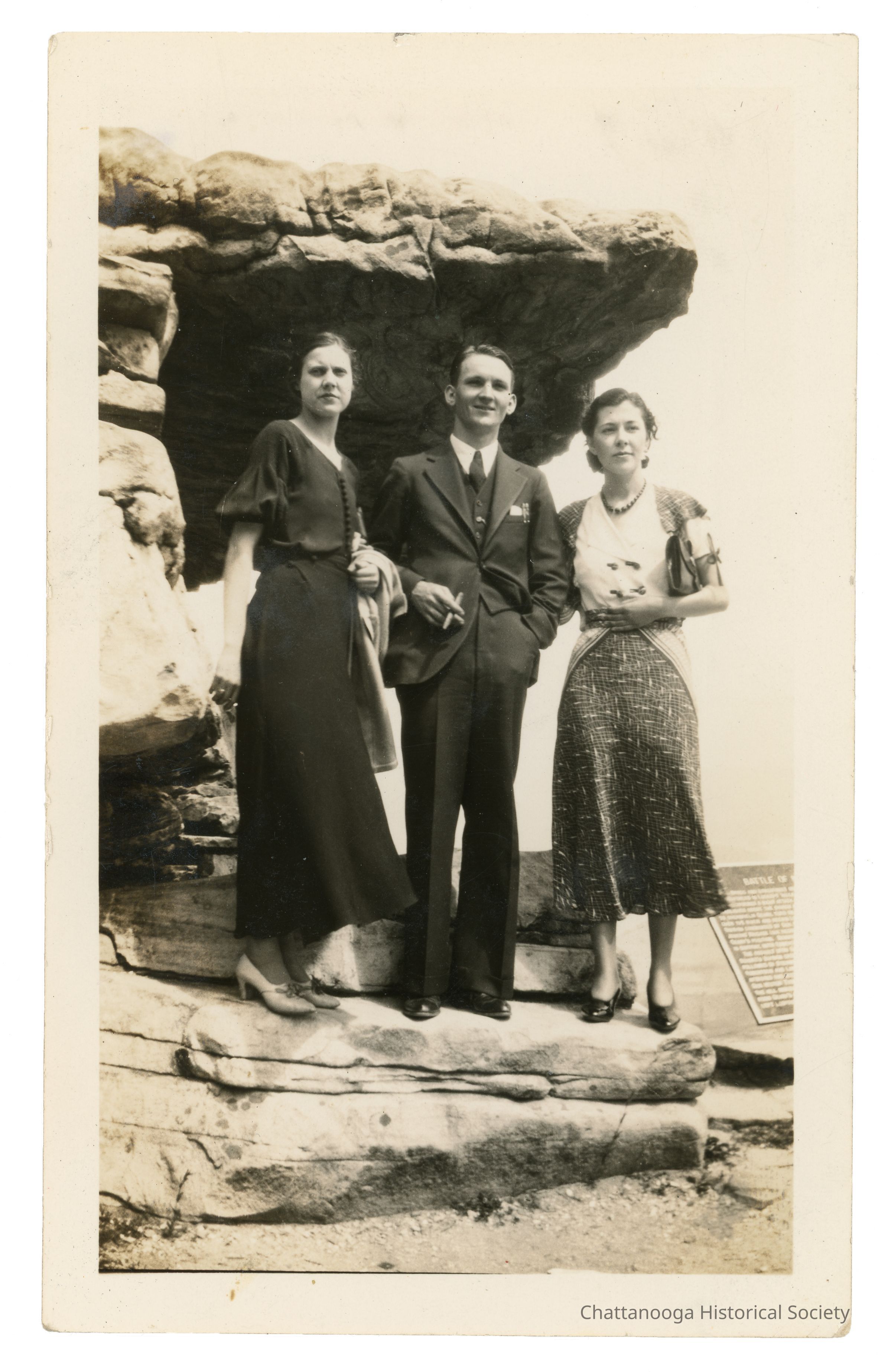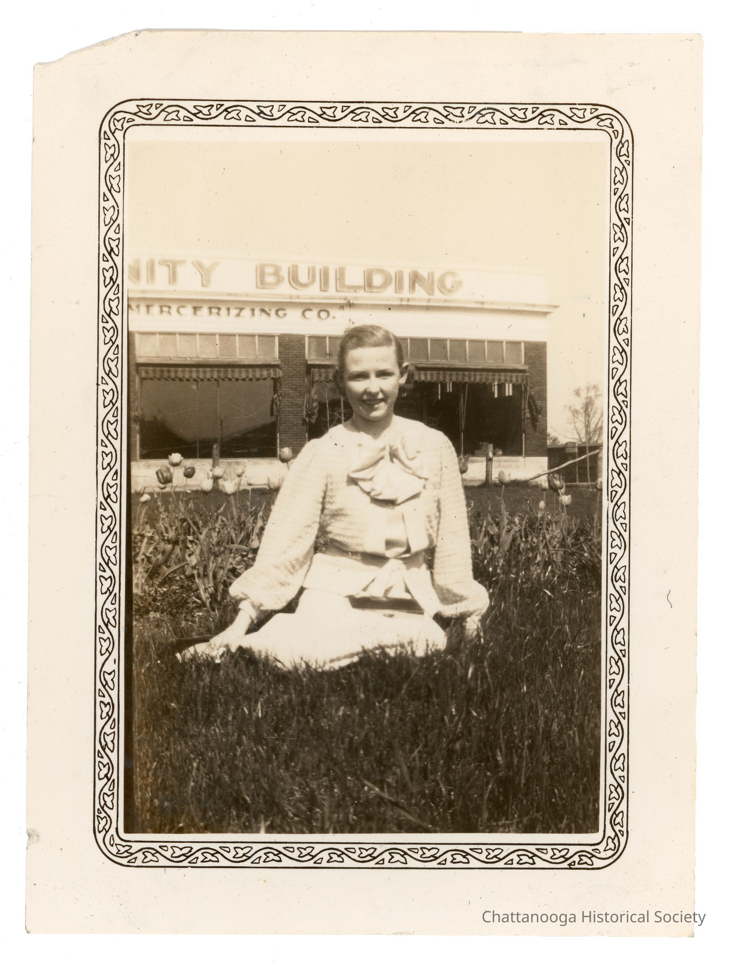 Green, post bound album with black pages. The photographs date to the early 1920s to the 1940s. Photographs include: