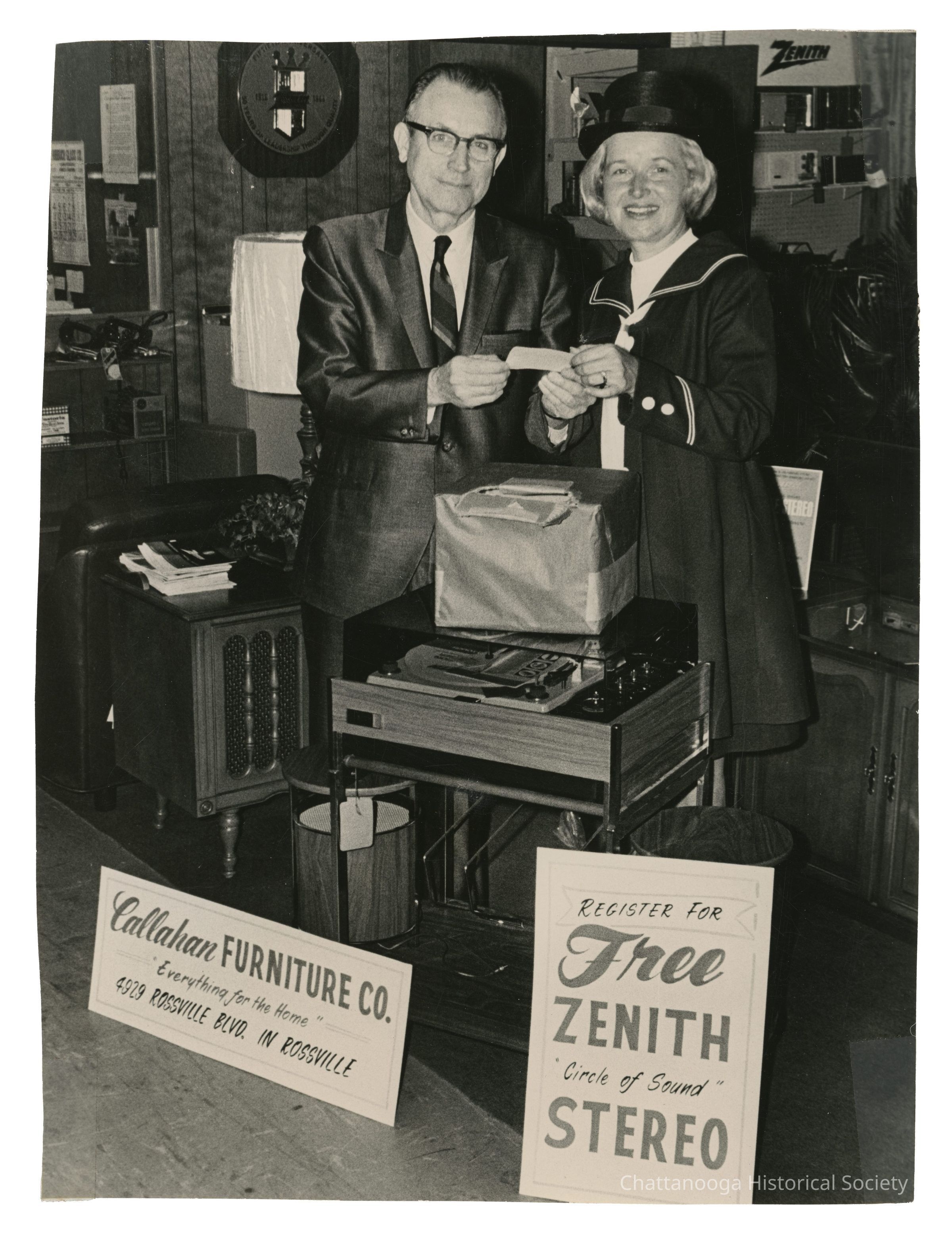 Black and white photograph, likely for promotional purposes, of a man and women holding a slip of paper pulled from a paper-wrapped box. The pair are standing behind a Zenith turntable. There are two signs in front of the record table; the one of the left reads "Callahan Furniture Co. | "Everything for the Home" | 4929 Rossville Blvd. in Rossville" and the one on the right reads "Register for | Free | Zenith | "Circle of Sound" | Stereo". Furniture and other electronics are around on display in the background. The photograph rear is stamped "Photo by | George Moody | News-Free Press" with "Zenith Drawing" written in red ink at the bottom.Photograph Details