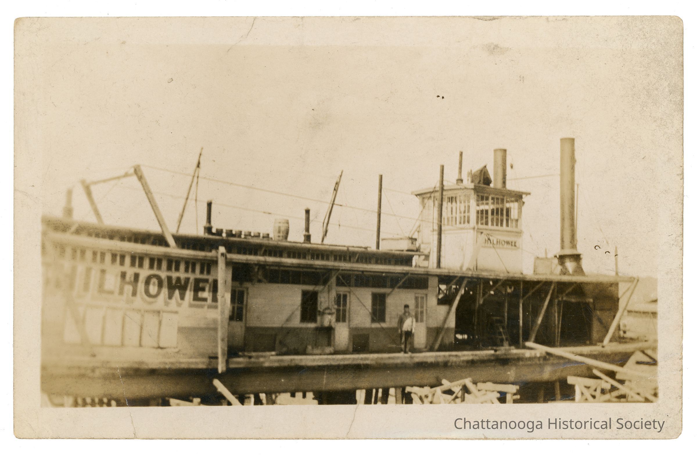 Black and white image of a flat bottomed, sternwheel towboat on drydock. The steamboat, the Chilhowee, has one level with a glass window wheelhouse above the maindeck, in front of the smokestacks. The name of the boat, Chilhowee, is painted on the wall of the main deck as well as underneath the windows of the wheelhouse. The hull of the boat is being lifted with wooden pilings.Photograph Details