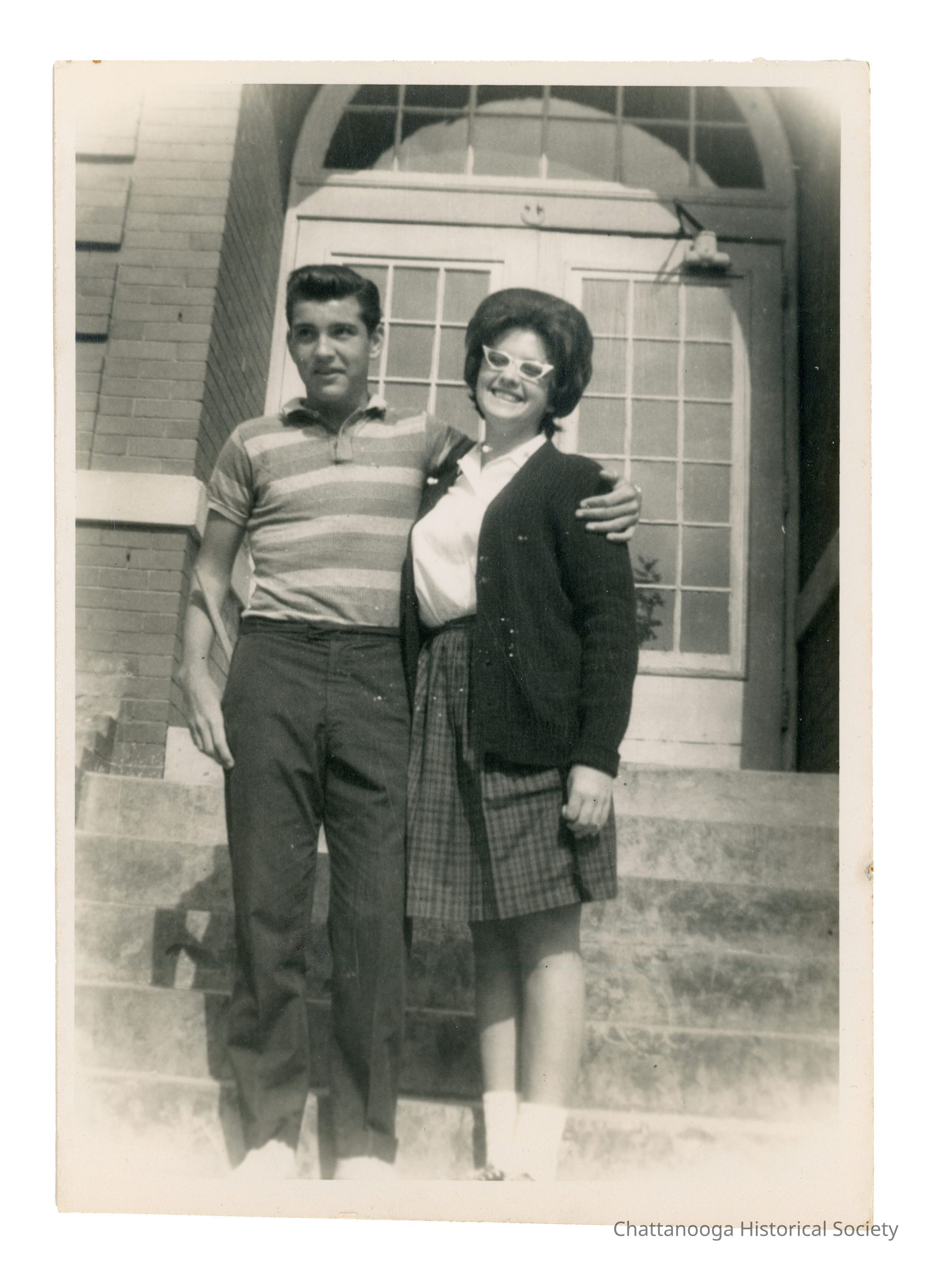 A black and white photograph of two students standing in front of the entrance of Hixson Highschool in 1963. The verso reads "Gary Mables | & | Debby Pickett | Hixson High | 1963".Photograph Details