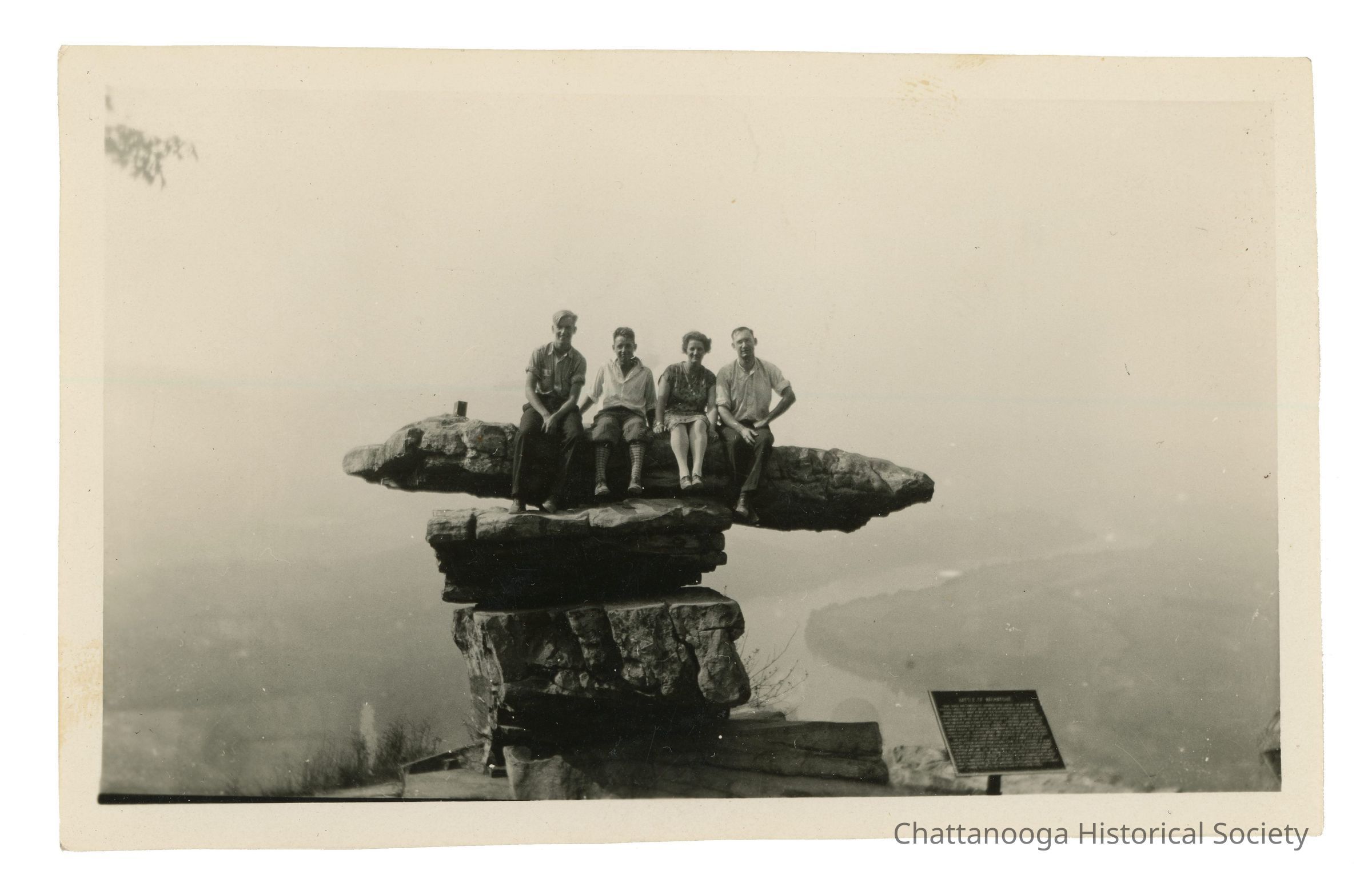 Black and white photograph of a group sitting on the top of Umbrella Rock. The photo shows two young men sitting with a man and a woman with the Tennessee River in the background.Photograph Details