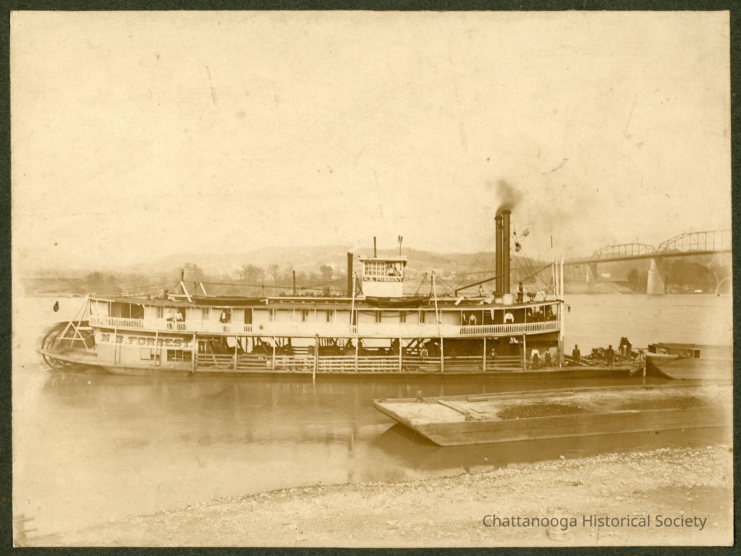 Black and white photograph of the sternwheel packet N.B. Forrest on the Tennessee River. The bow is facing the bridge with the starboard side pictured facing the banks of the river. A barge is floating in between the steam packet as the boat is pushing another barge. The stern wheel is in motion and smoke is coming from the stacks. A man is standing in the pilot house and there are several passengers and workers on the main and hurricane decks.Photograph Details