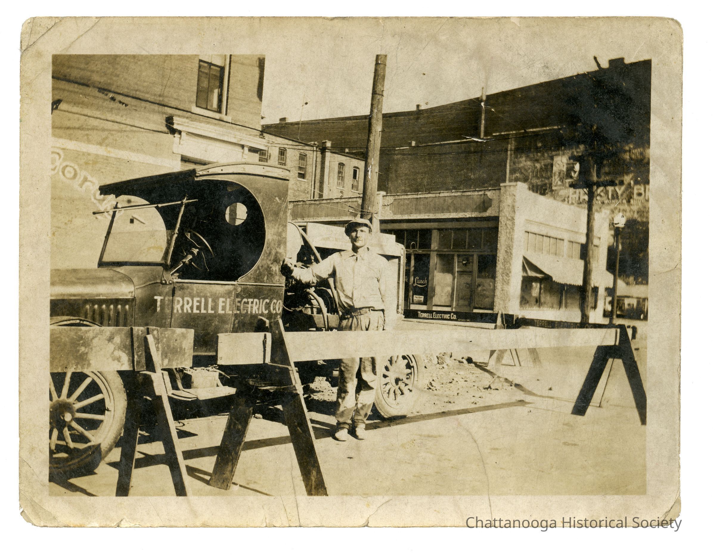 Black and white photograph of an unidentified man, employed by Terrell Electric Company, standing next to a work truck on a sidewalk in Chattanooga, Tennessee. The truck bed contains some sort of machinery, possibly a generator. The automobile is surrounded by sawhorses. Several businesses are in the background. The photograph is marked stamped with the Englerth's purple logo.Photograph Details
