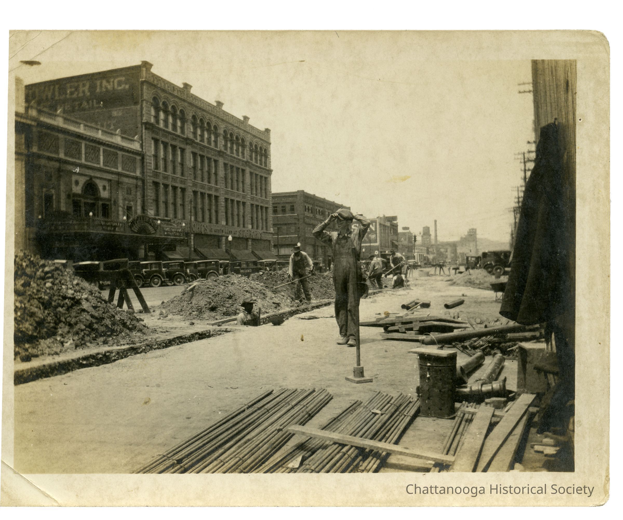 Black and white photograph of a Terrell Electric Company worker, center, walking down the sidewalk on Broad Street, adjusting his cap with other workers in the background. There are large pits dug into the sidewalks with piles of depbris beside the homes where the electrical company is working on adding lighting on Broad Street. The Tivoli and Fowler Furniture can be seen in the background with a number of automobiles parked on the street in front of the buildings. "1927" is written in pencil on the rear.Photograph Details