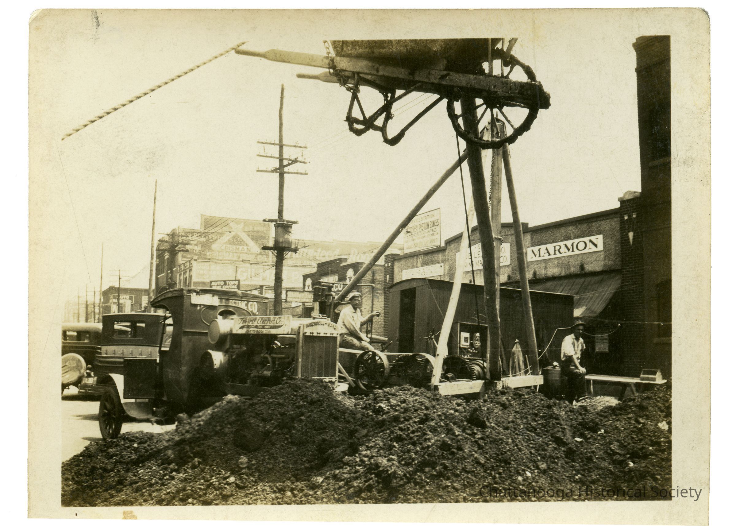 Black and white photograph of Terrell Electric Company workers doing work on Broad Street adding lighting onto the street. A company truck with a generator in the bed is being operated by a worker who is lowering a wheelbarrow by winch into a pit on the sidewalk.Photograph Details