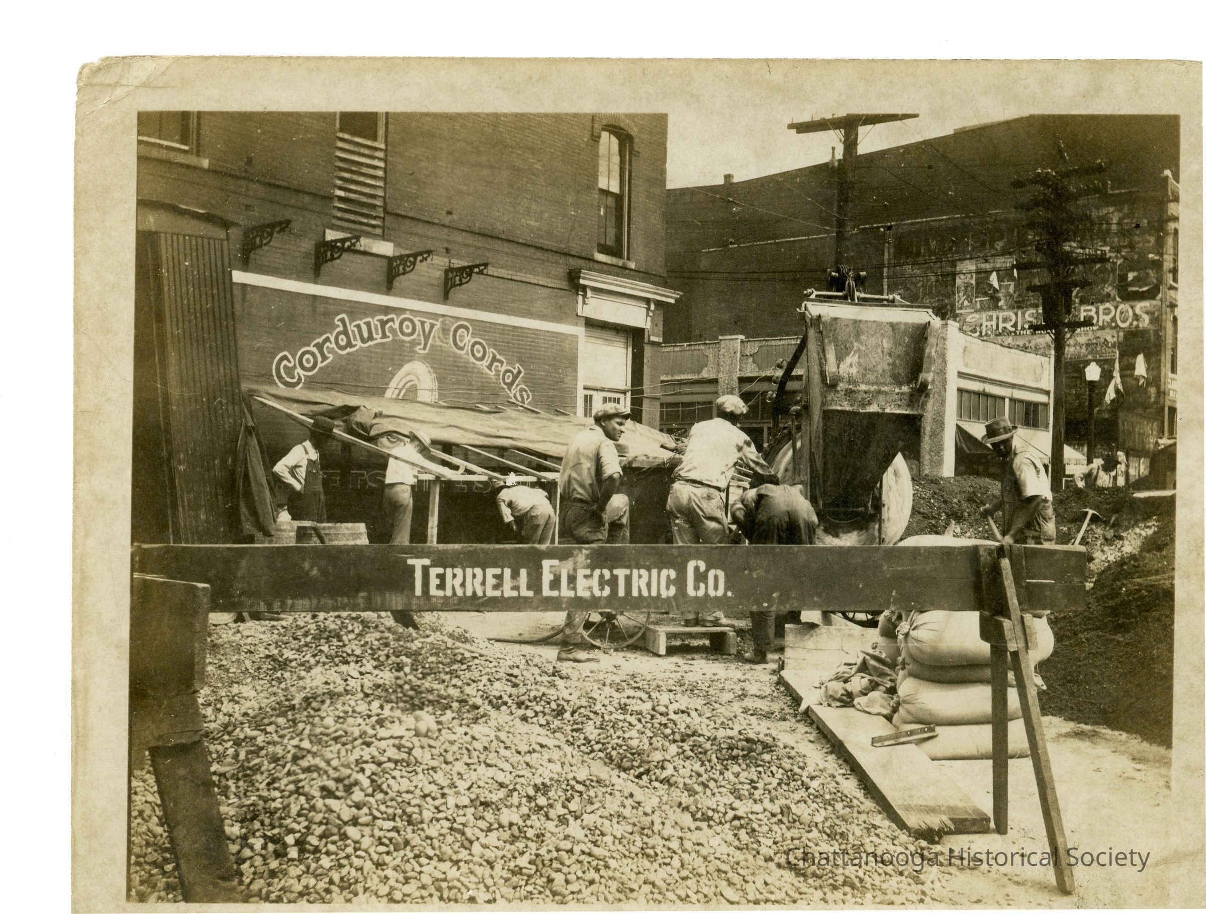 Black and white photograph of Terrell Electric Company work on the sidewalks of Broad Street to add street lamps. A sawhorse belonging to Terrell Electric Company is blocking pedestrians from the work on the sidewalks and the "Corduroy Cords" advertisement painted on the wall can be seen in the background. "1927" is written in pencil on the rear.Photograph Details