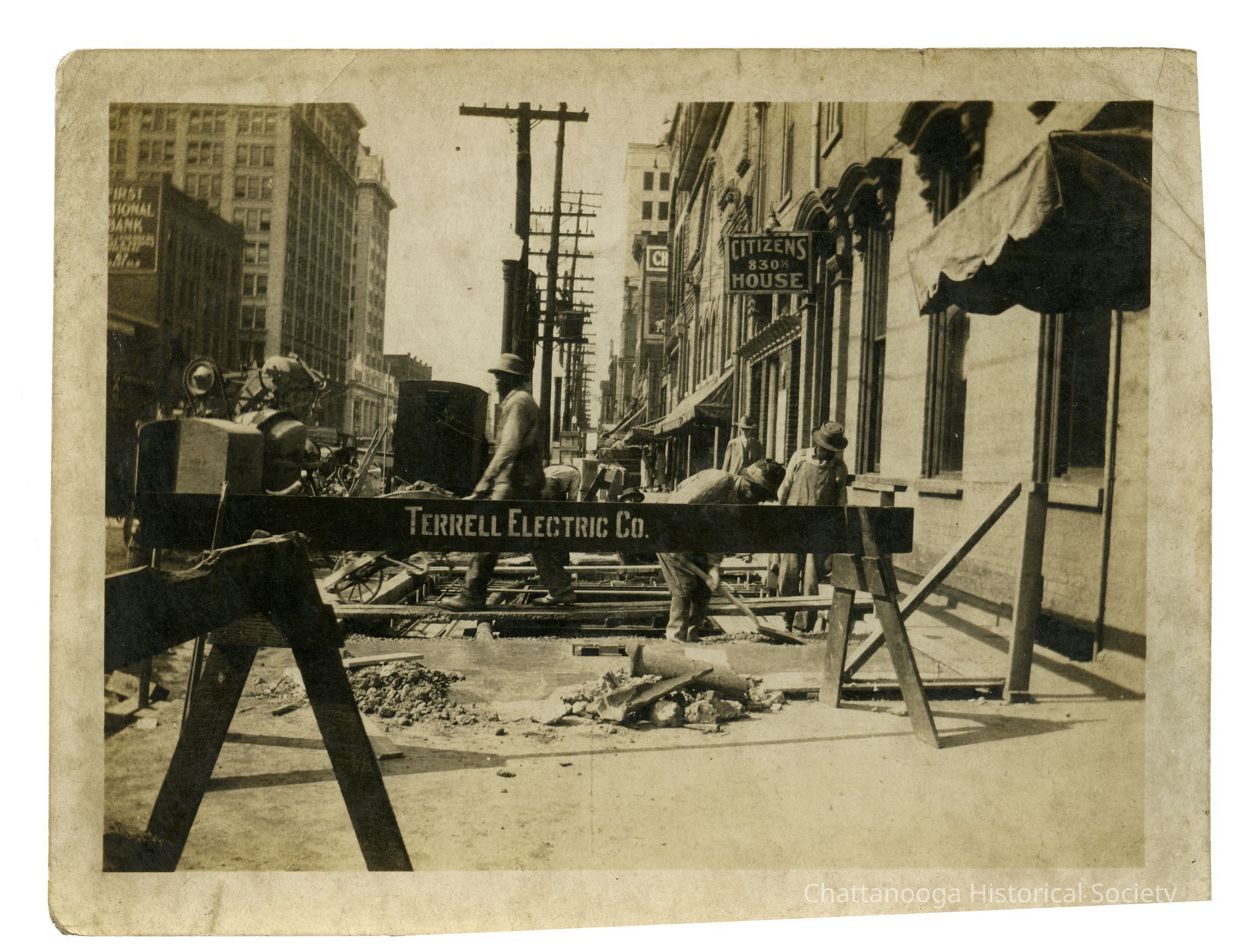 A black and white photograph of workers from Terrell Electric Company working on Broad Street. A Terrell Electric Co saw horse is in the foreground blocking the sidewalk with three company workers working on the sidewalk in front of Citizens House (830 Broad Street).Photograph Details