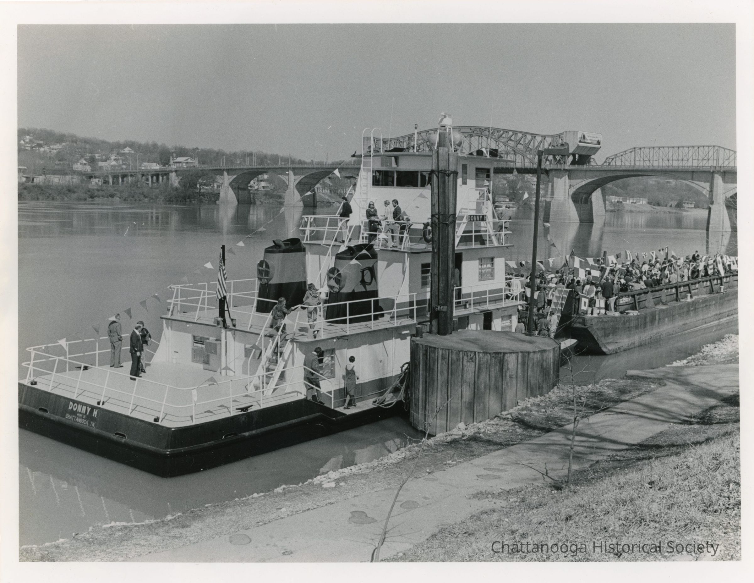 Black and white photograph showing the towboat "Donny H" anchored on the Tennessee River on the day of its public launch. The photograph shows the stern and starboard side of the boat with the bow facing the Market Street Bridge. A barge is attached to the bow of the boat with a large group of people present for the launch. There are people touring the boat, with people on the decks and walkways. The boat was owned by the Dixie Sand and Gravel Company. The verso is stamped "Rick Owens | The Chattanooga Times".Photograph Details