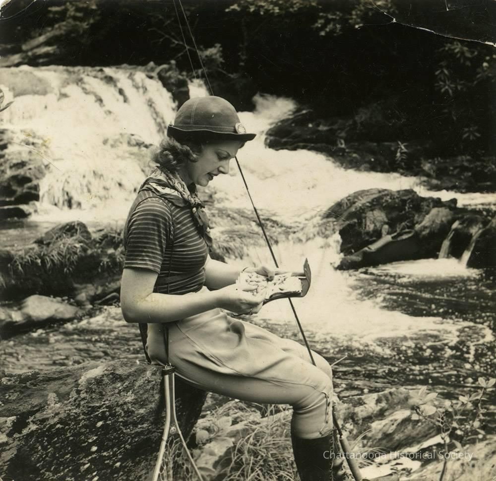 Black and white photograph of a woman choosing lures while sitting beside a small fall on a river. The woman is wearing a striped shirt tucked into khaki jodhpurs that are tucked into lace up leather knee boots. She is wearing a short brimmed hat on her head and is holding a leather pouch, likely with lures or hooks inside, and a net is attached to a leather belt over her shoulder. She is seated on a rock beside a small falls, possibly identified as Bald River Falls, Tellico Plains, Marion County, Tennessee.
