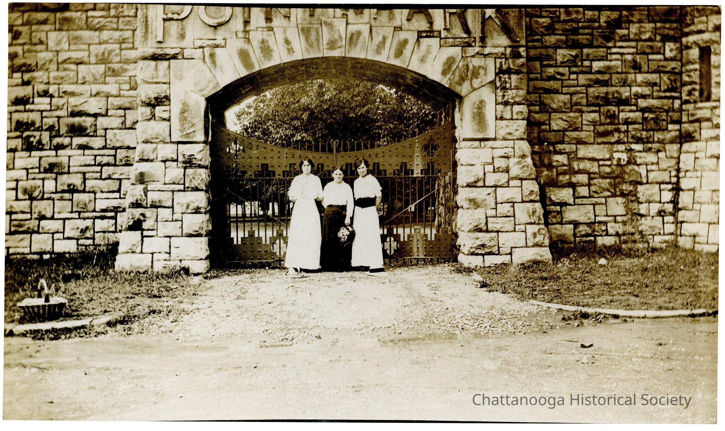 A black and white photograph showing three women standing at the entrance of Point Park on Lookout Mountain, Tennessee. The photograph shows the iron gates of the park behind the women closed. A picnic basket is sitting on the ground at the bottom left of the photograph.