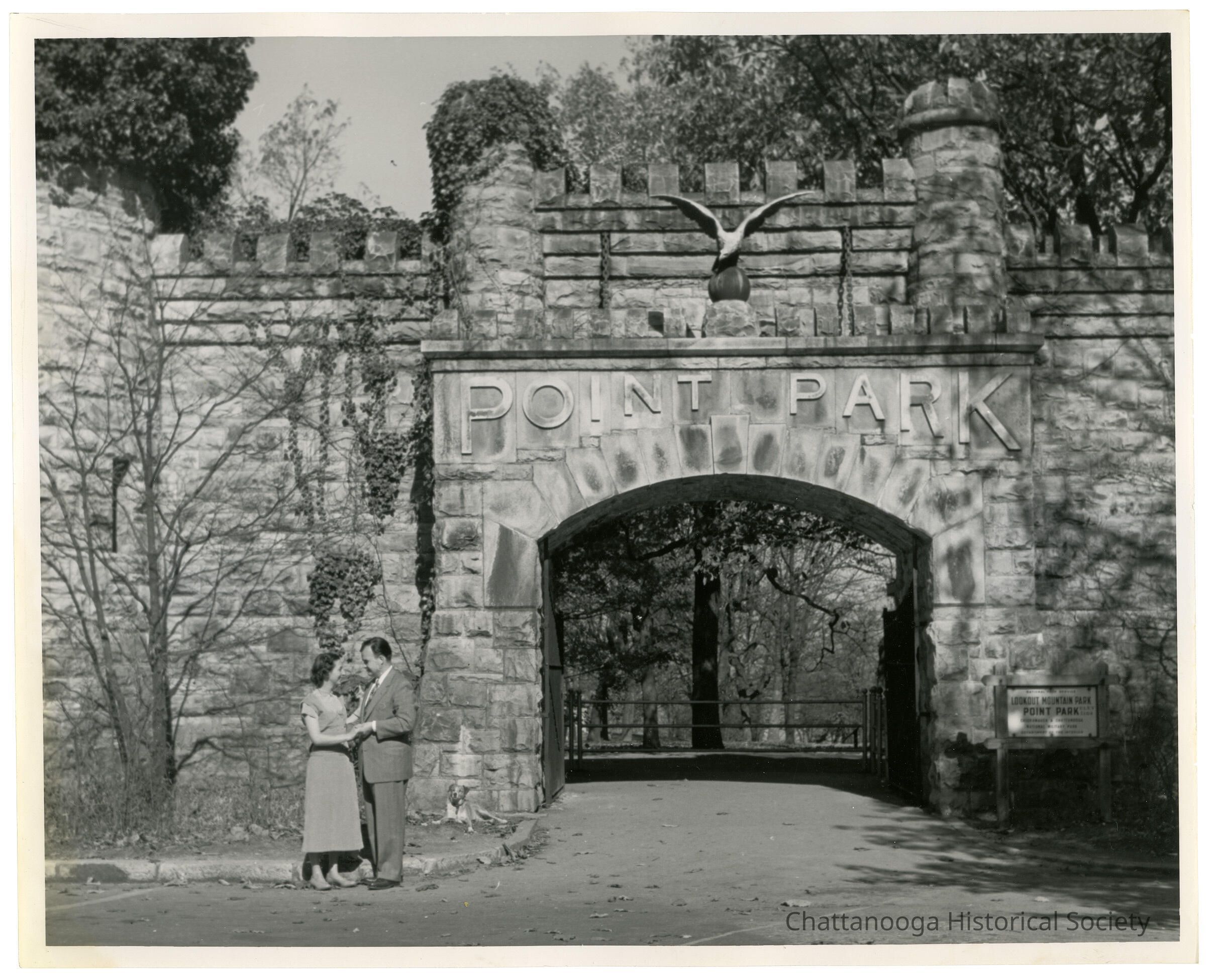 A black and white photograph of a couple standing in front of the entrance to Point Park atop Lookout Mountain, Tennessee with a dog laying behind them.Photograph Details