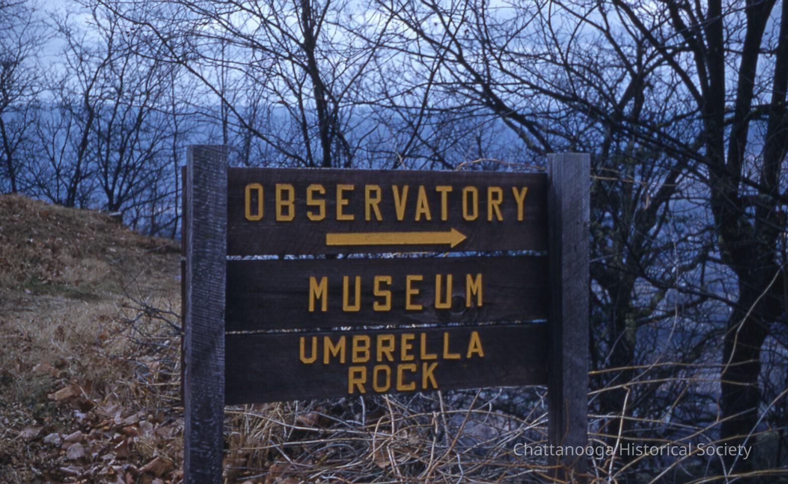 A Kodachrome Transparency slide image of a wooden sign with yellow lettering. The sign is constructed with two 4X4 wooden parallel posts with three flat boards to form the sign face. The top board features the word "OBSERVATORY" with a yellow arrow. The second plank reads "MUSEUM" and the one below, "UMBRELLA | ROCK". Through the surrounding trees, the Chattanooga Valley can be seen.