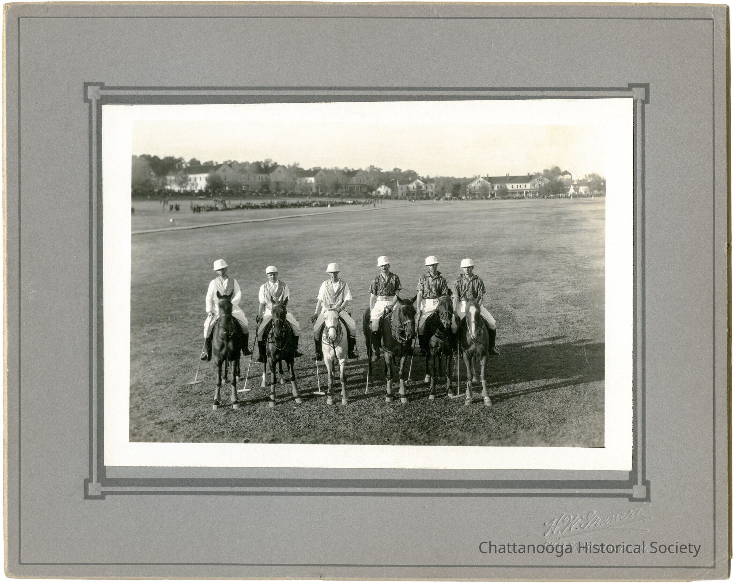 A photograph showing six polo players on horses at the Barnhardt Circle parade grounds at Fort Oglethorpe, Georgia. In the distance are the officers’ barracks. The three men on the left are wearing light shirts with grey vests while the men on the right are wearing darker silks. All six riders are wearing white helmets and holding long mallets.