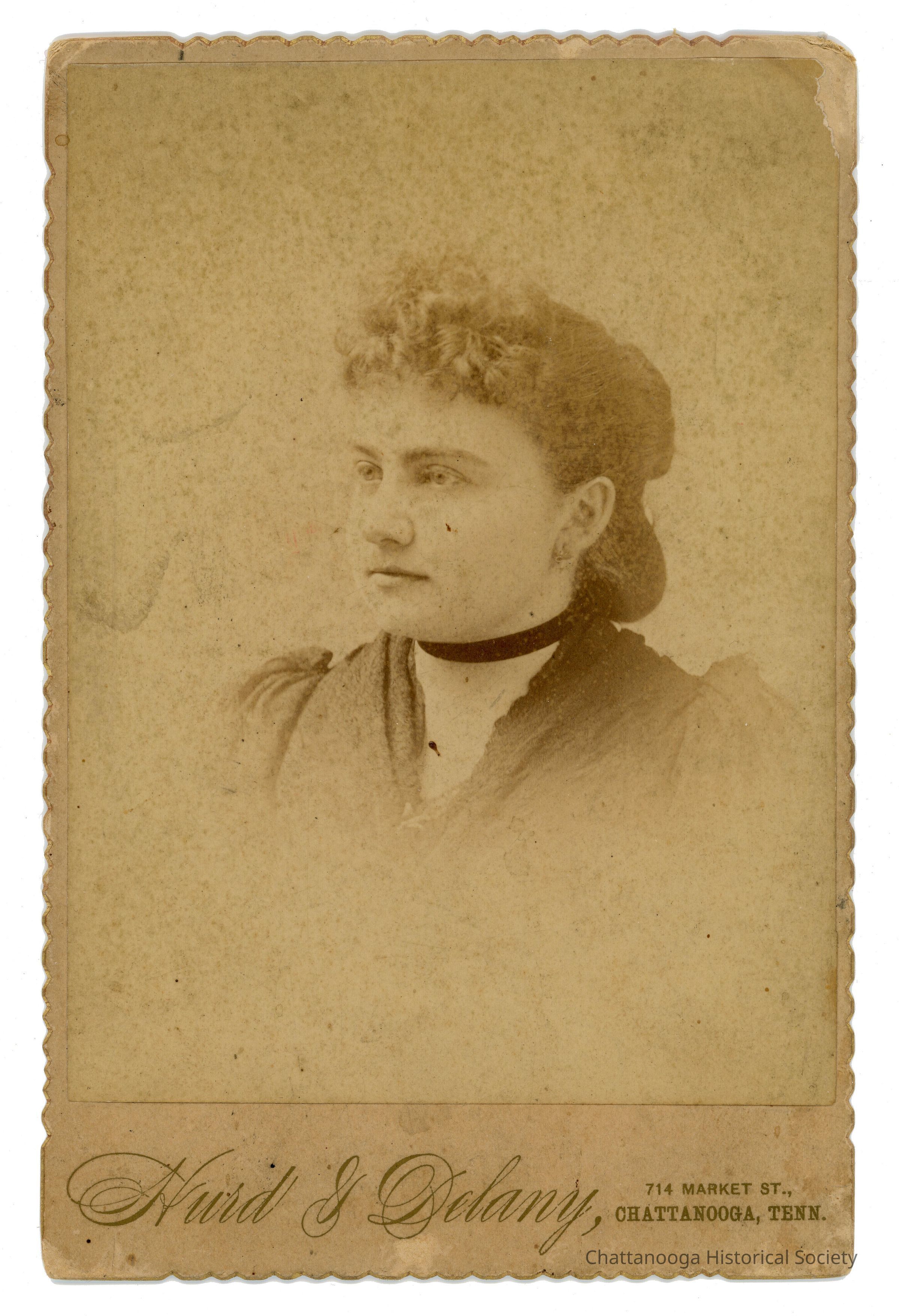 Black and white studio portrait mounted on a cabinet card with a beveled, decoratively cut edge. The photograph shows a young woman with a dark choker necklace and a dark top. Her hair is curled at the front and half up in a bun style in the back with the rest likely bound in netting. The bottom gutter of the cabinet card reads "Hurd & Delaney, 714 Market St., | Chattanooga, Tenn."Photograph Details
