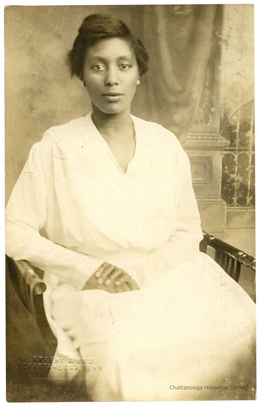 Black and white photograph developed on postcard paper of an unidentified woman. She is wearing a long sleeved, white dress with pearl earrings. She is posed sitting in a savonarola chair in front of a backdrop painted with a large drape in front of a column and metal gate. The photograph is embossed "Greene & Bro, Chattanooga, Tenn." at the bottom left.Photograph Details