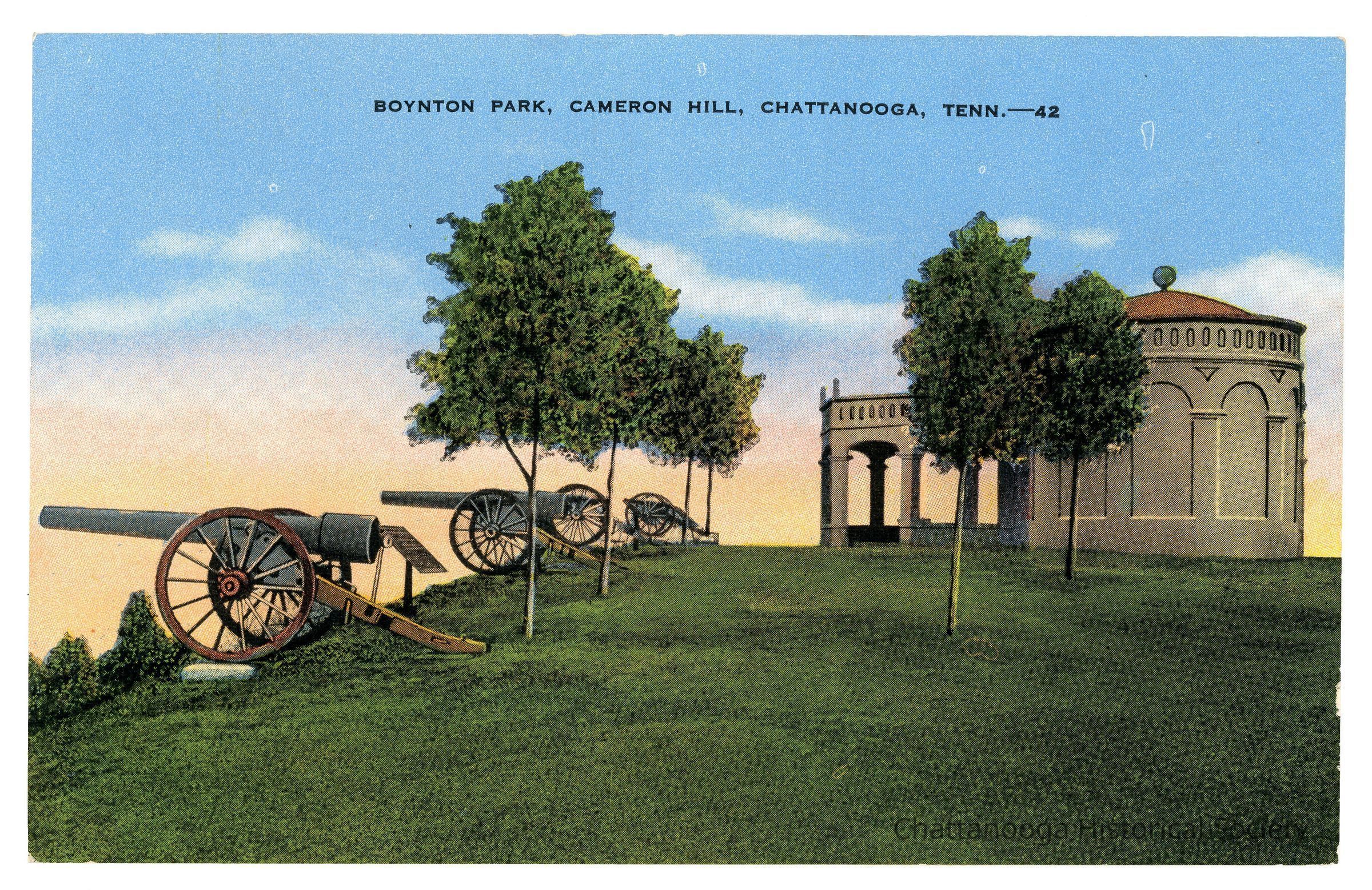 A halftone color postcard for Boynton Park on Cameron Hill. The view shows a water tower with colonnaded pavilion projecting from it and has four cannons on the side. The information on the verso reads "Boynton Park occupies the summit of Cameron Hill overlooking the city. From this elevation in every directions is unfolded a panorama of unparalleled beauty."Subject