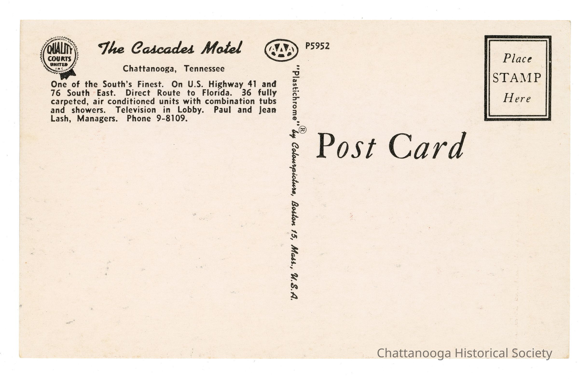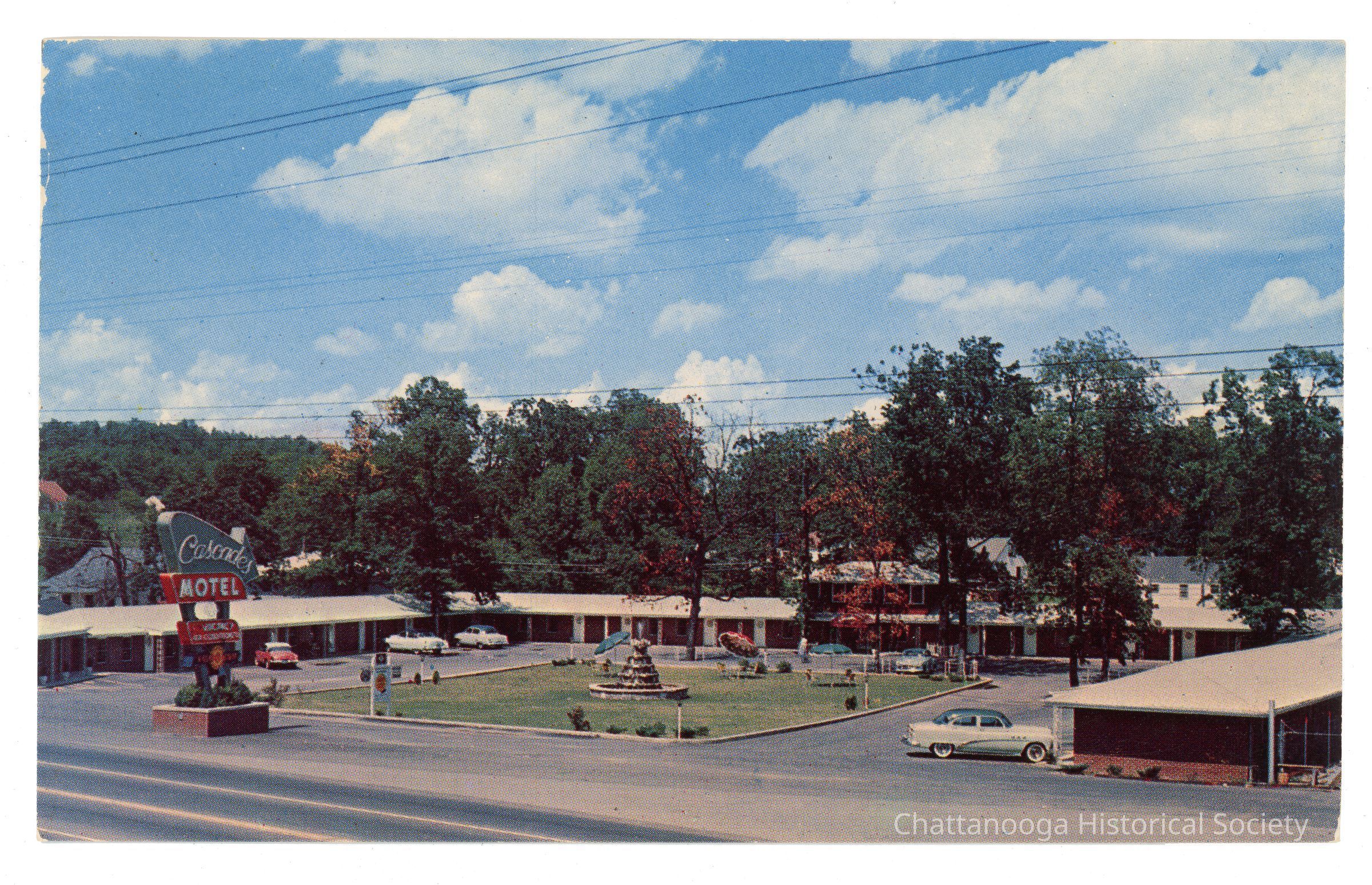 A halftone postcard showing the front facades of the Cascade Motel. The view shows the U-shaped motel complex with a central square that features a tiered fountain at center and umbrella covered seating. At the base of the "U", a two-story office is at center.
