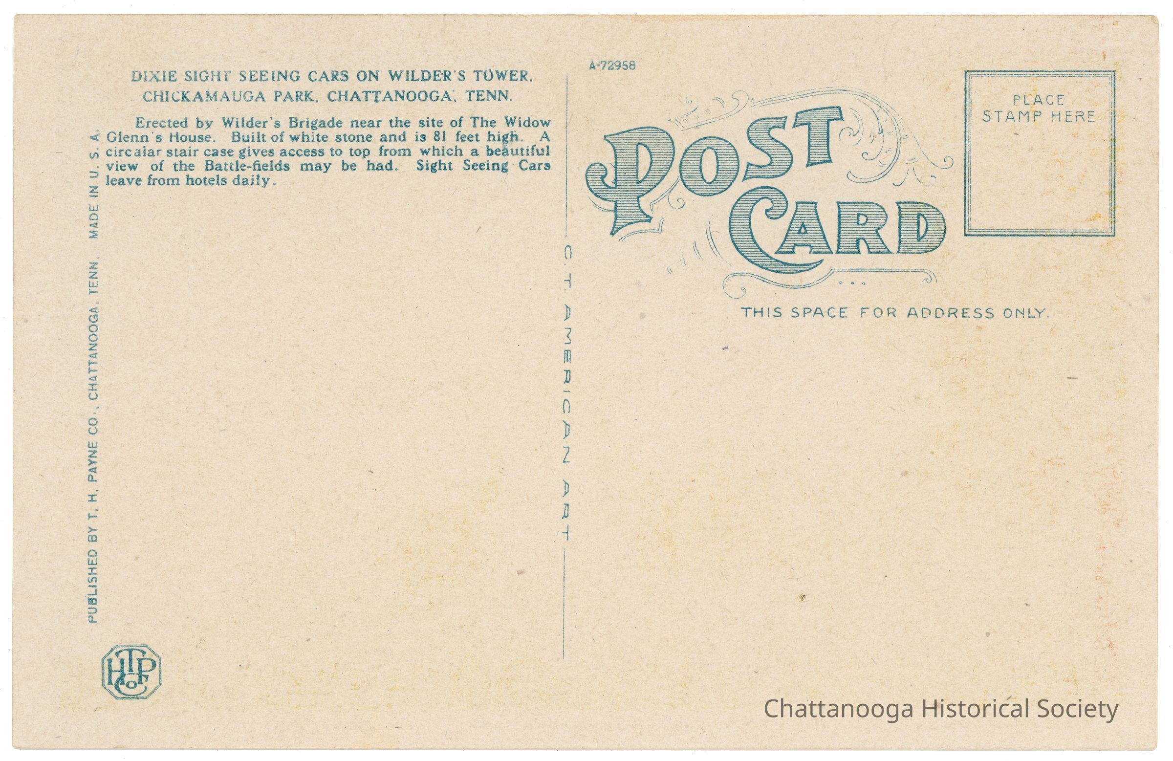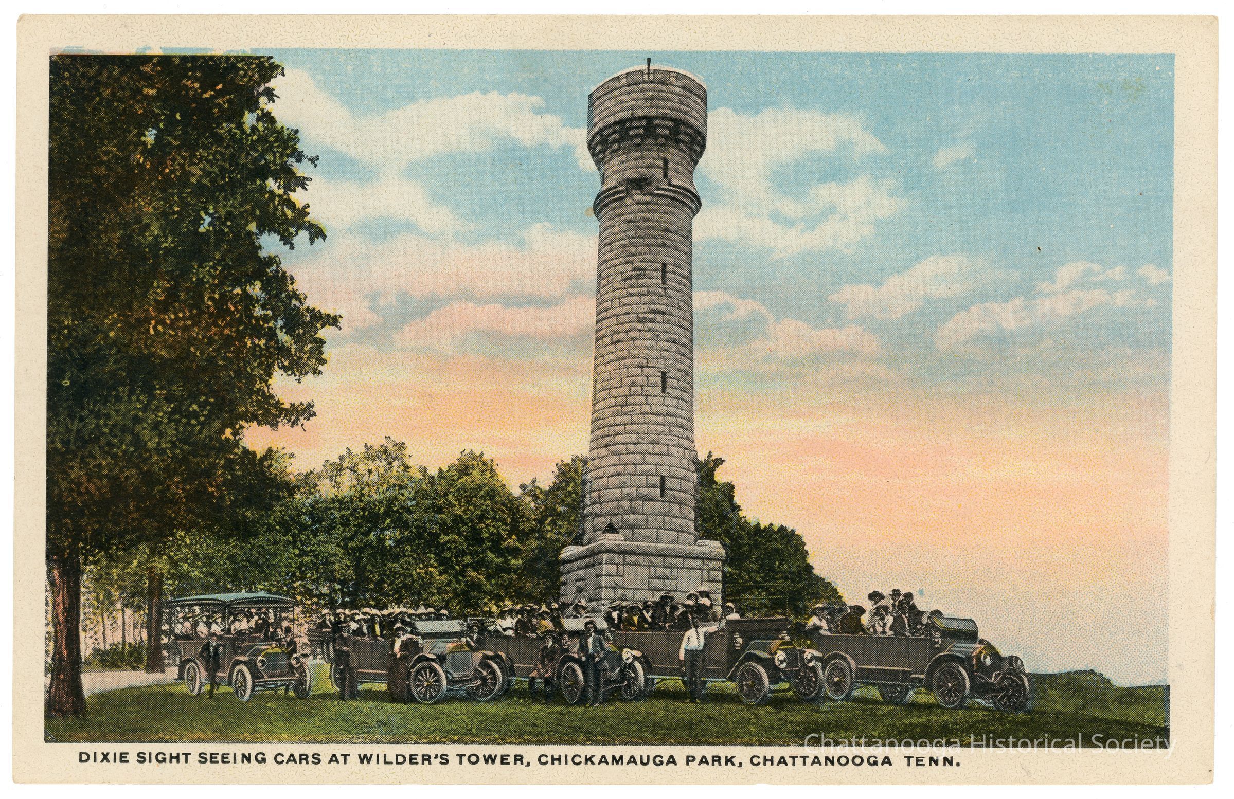 A halftone postcard showing the fleet of the Dixie Sight Seeing Company parked in front of Wilder's Tower at Chickamauga Park. The informaiton on the verso reads "Dixie Sight Seeing Cars on Wilder's Tower, | Chickamauga PArk, Chattanooga, Tenn. | Erected by Wilder's Brigade near the site of The Widow | Glenn's House. Built of white stone and is 81 feet high. A | cicalar stair case gives access to top from which a beautiful | view of the Battle-fields may be had. Sight Seeing Cars | leave from hotels daily."Subject Person/Organization
