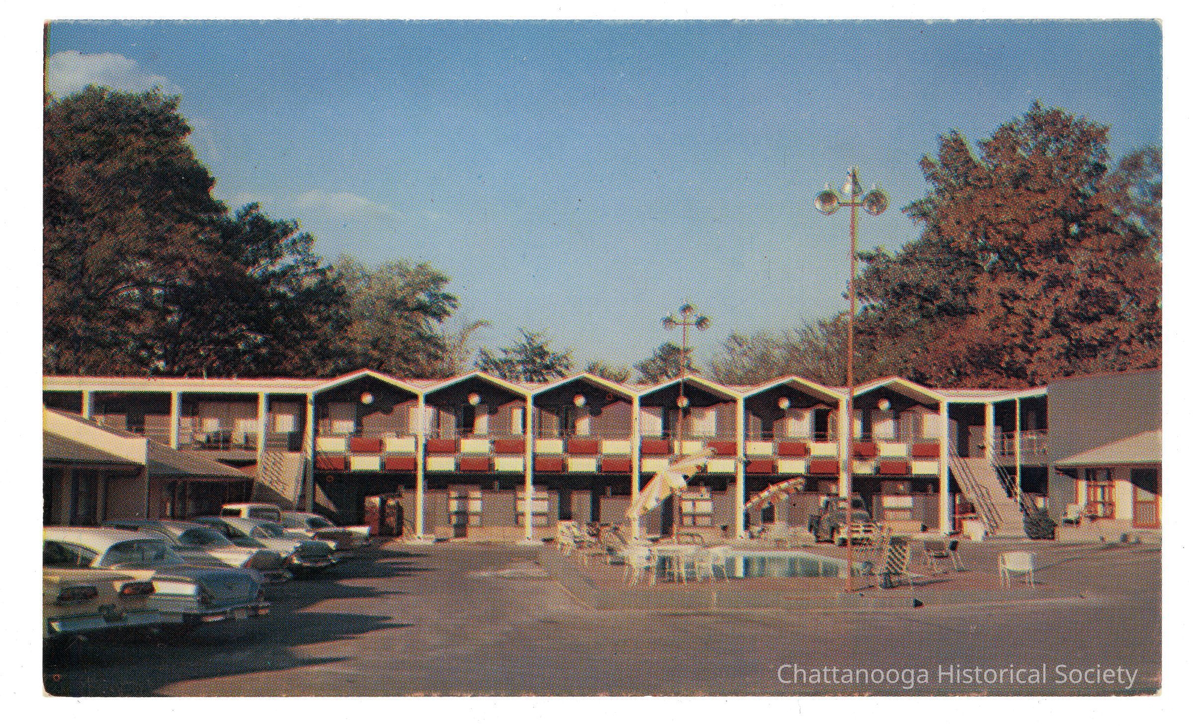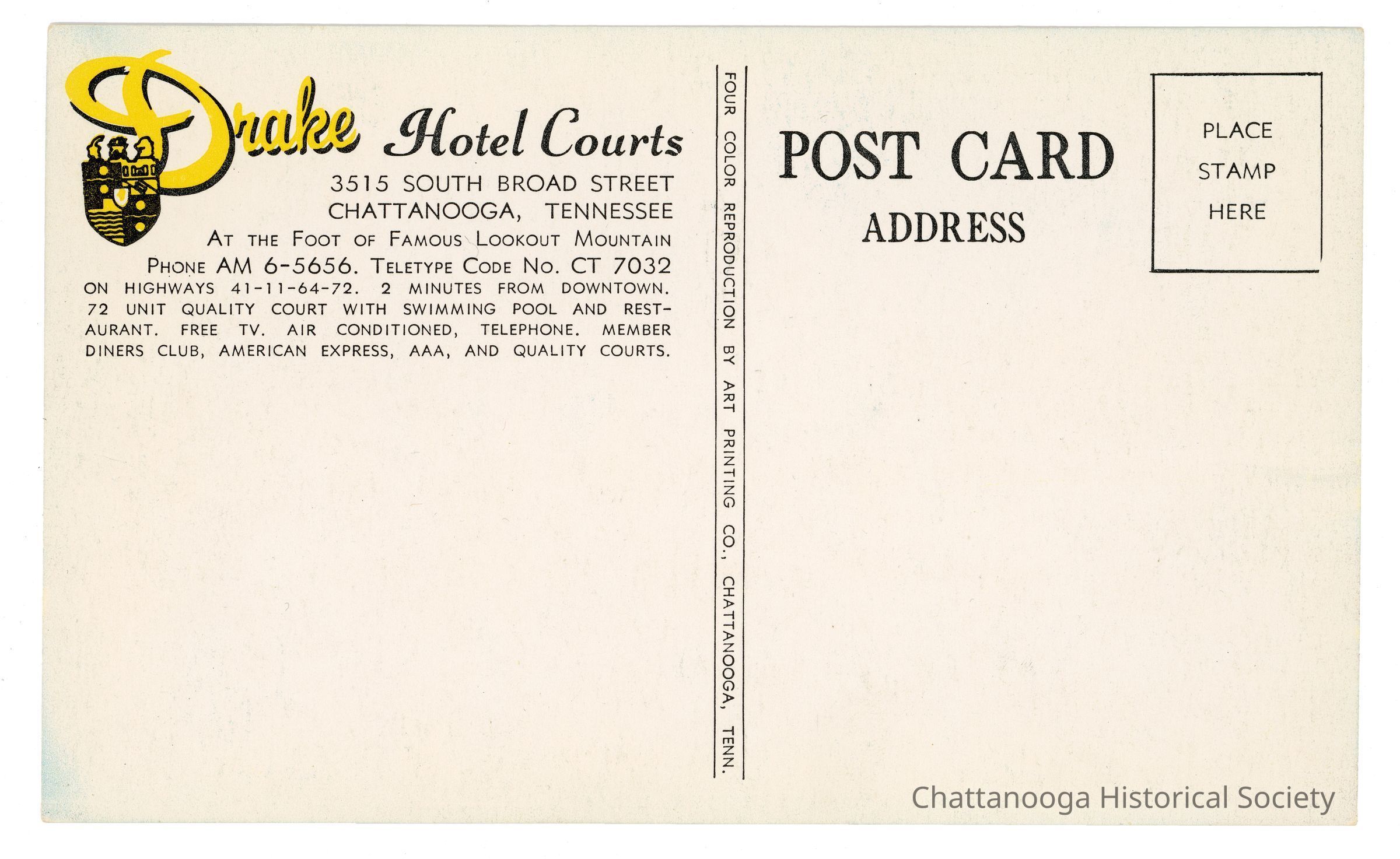 A halftone postcard showing the Drake Hotel Courts on Broad Street in Chattanooga, Tennessee. The image shows the rear hotel portion with a googie-style, zig-zag roof and red and white panels on the balustrade. The swimming pool is seen at center as well as multiple automobiles parked out beside the buildings, all with tail fins and 1950s era details.