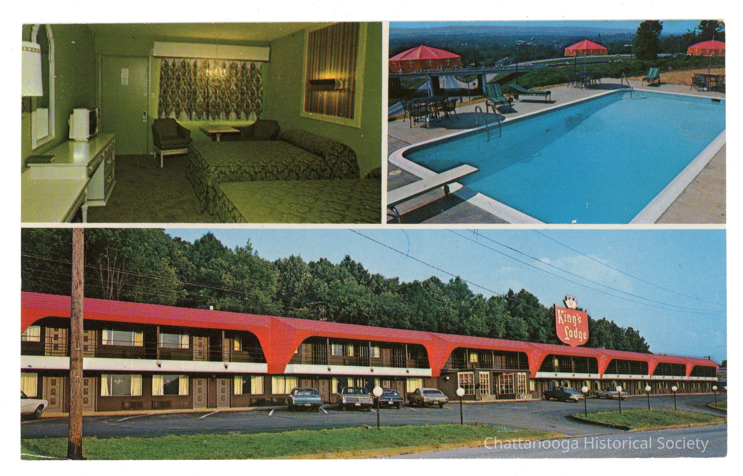 A halftone postcard with three panels showing the King's Lodge. The top two panels show a room interior (left) with green walls, furniture, and green tapestry curtains and matching bedspreads on the two beds, and the swimming pool (right) overlooking the interstate with red umbrellas and lounge chairs. The bottom panel shows the two-story hotel with a red overhanging roof and the large King's Lodge sign to the right with a white crown on the top.