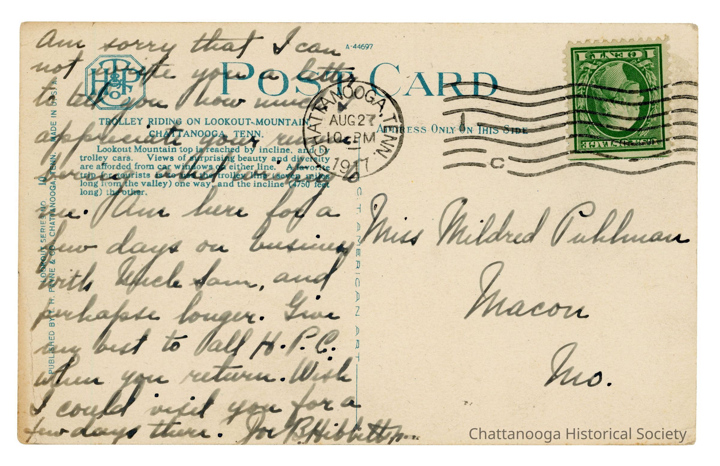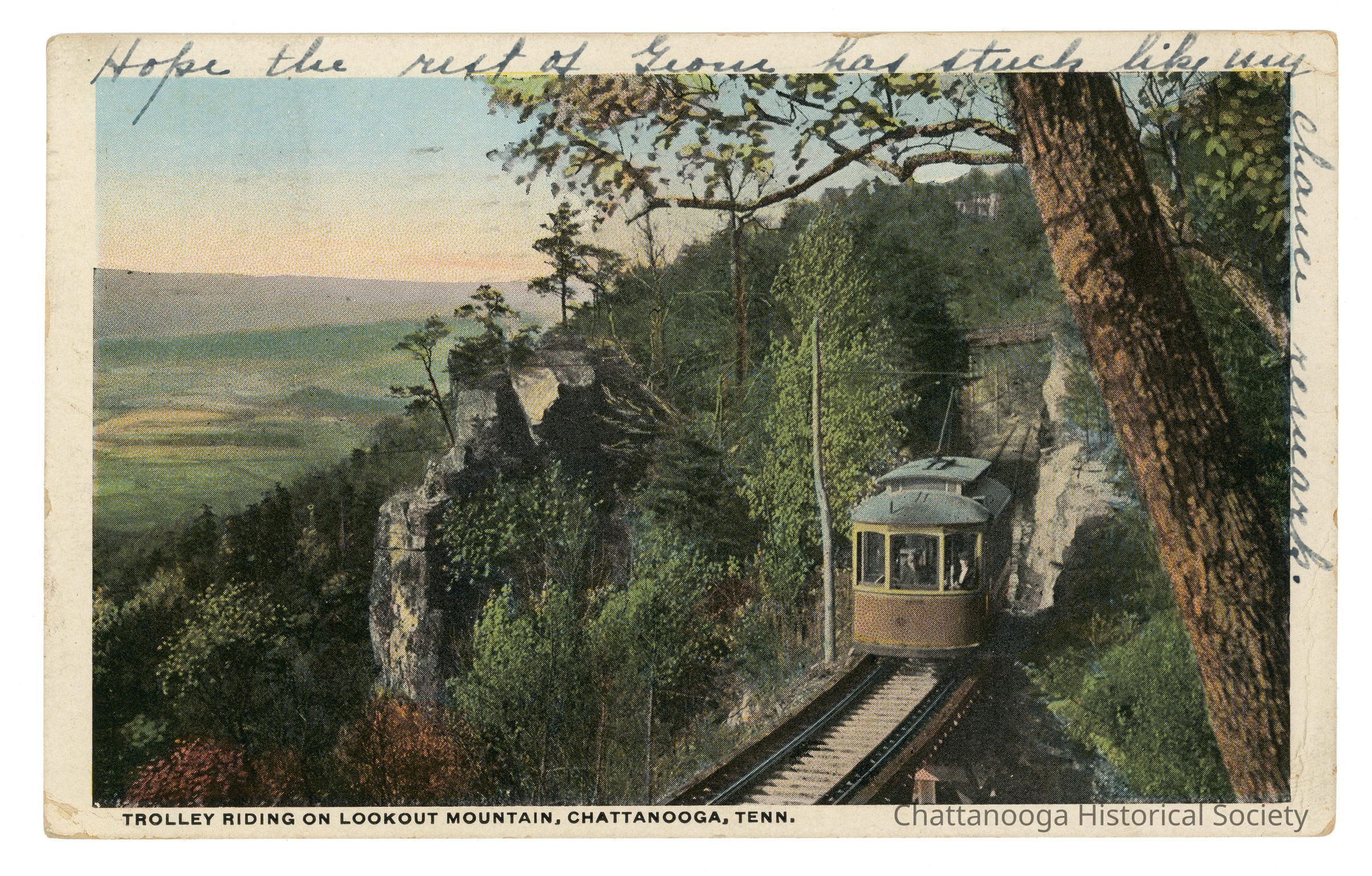 The information on the rear reads "Trolly Riding on Lookout-Mountain |Chattanooga, Tenn, | Lookout Mountain top is reached by incline, and by | trolley cars. Views of surprising beauty and diversity | are afforded from car windows on either line. A favorite | trip for tourists is to use the trolley line (seven miles | long from the valley) one way and the incline (750 feet | long) the other."Collection
