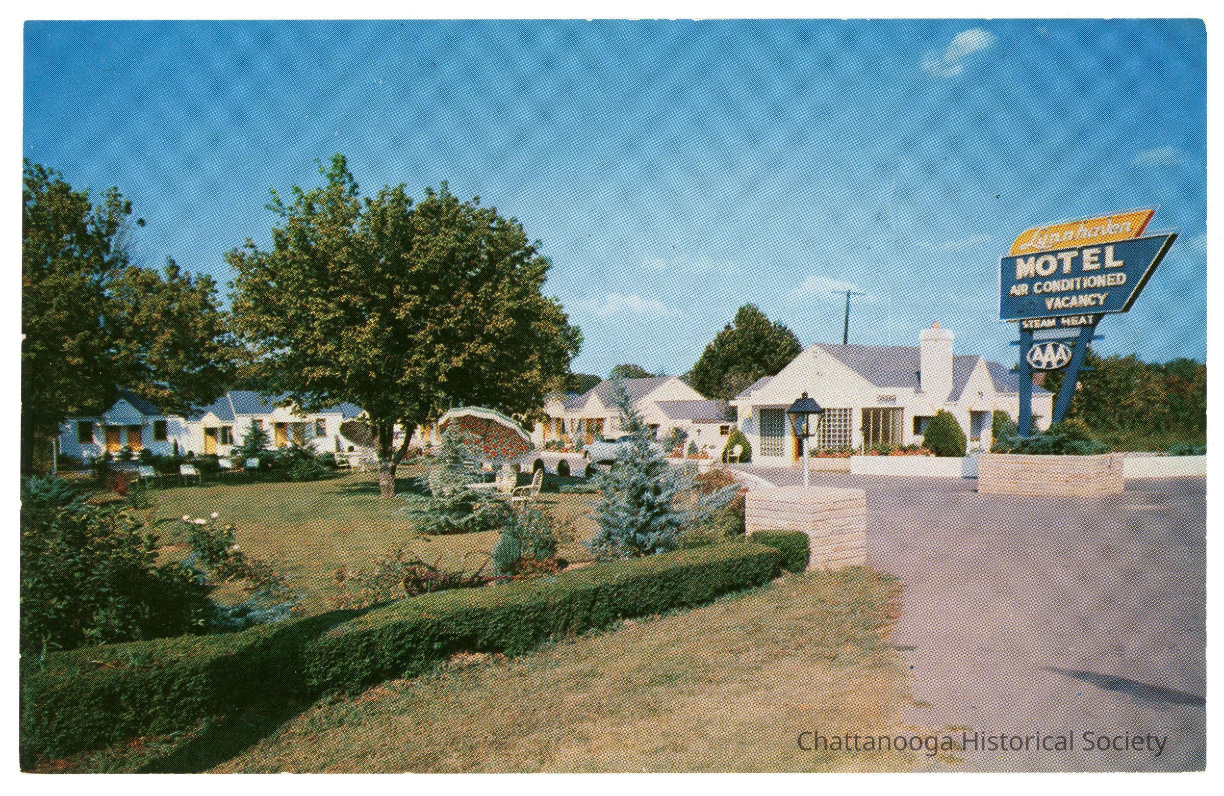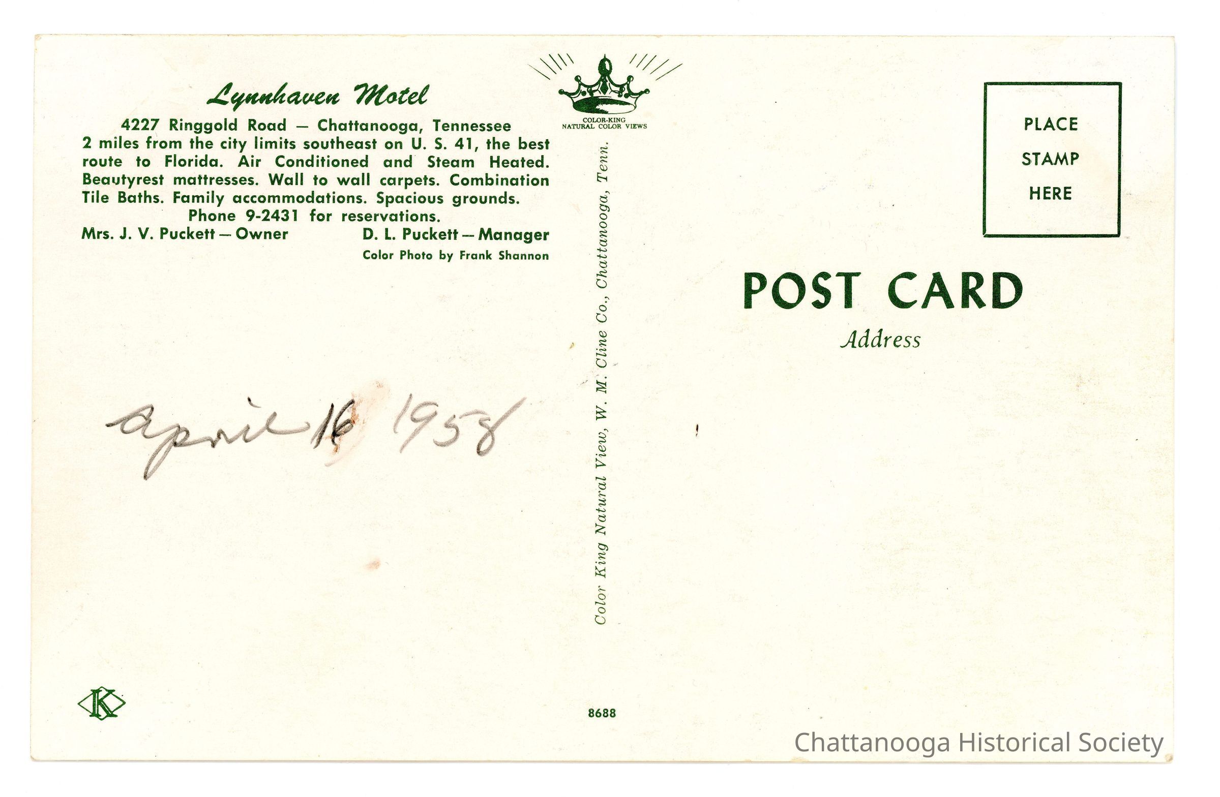 The information on the rear reads "Lynnhaven Motel | 4227 Ringgold Road - Chattanooga, Tennessee | 2 miles from the city limits southeast on U.S. 41, the best | route to Florida. Air Conditioned and Steam Heated. | Beautyrest mattresses. Wall to wall carpets. Combination | Tile Baths. Family accommodations. Spacious grounds. | Phone 9-2431 for reservations | Mrs. J.V. Puckett - Owner D.L. Puckett- Manager | Color Photo by Frank Shannon". "April 16, 1958" is written in pencil. The postcard is a Color King Natural View postcard.Subject Person/Organization