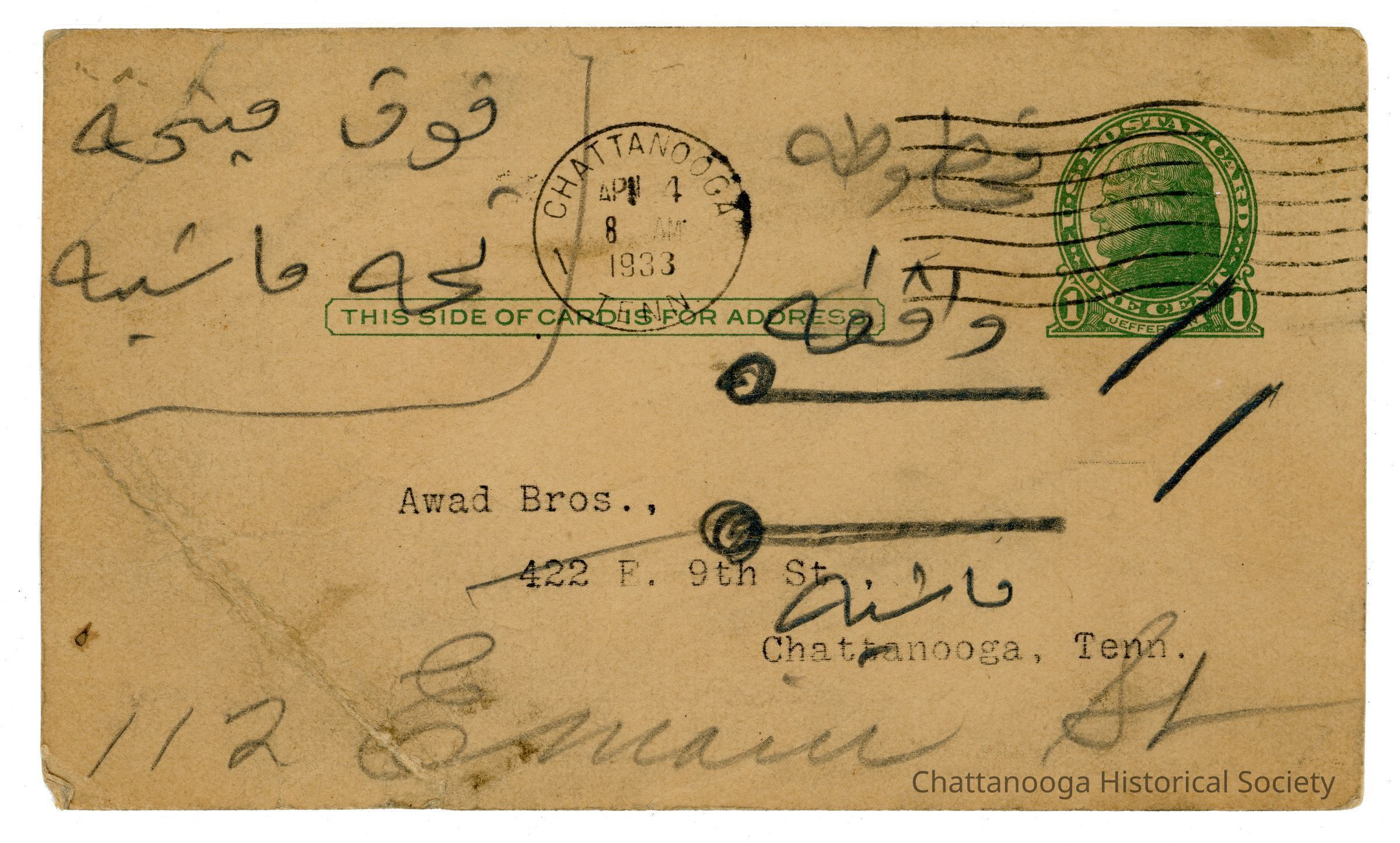 On the verso, the postal card is addressed to Awad Brothers. At the top and across the center, words in Arabic have been written. The original address, 422 9th St, Chattanooga, has been marked out and "112 E Main St." is written in pencil on the bottomSubject Person/Organization