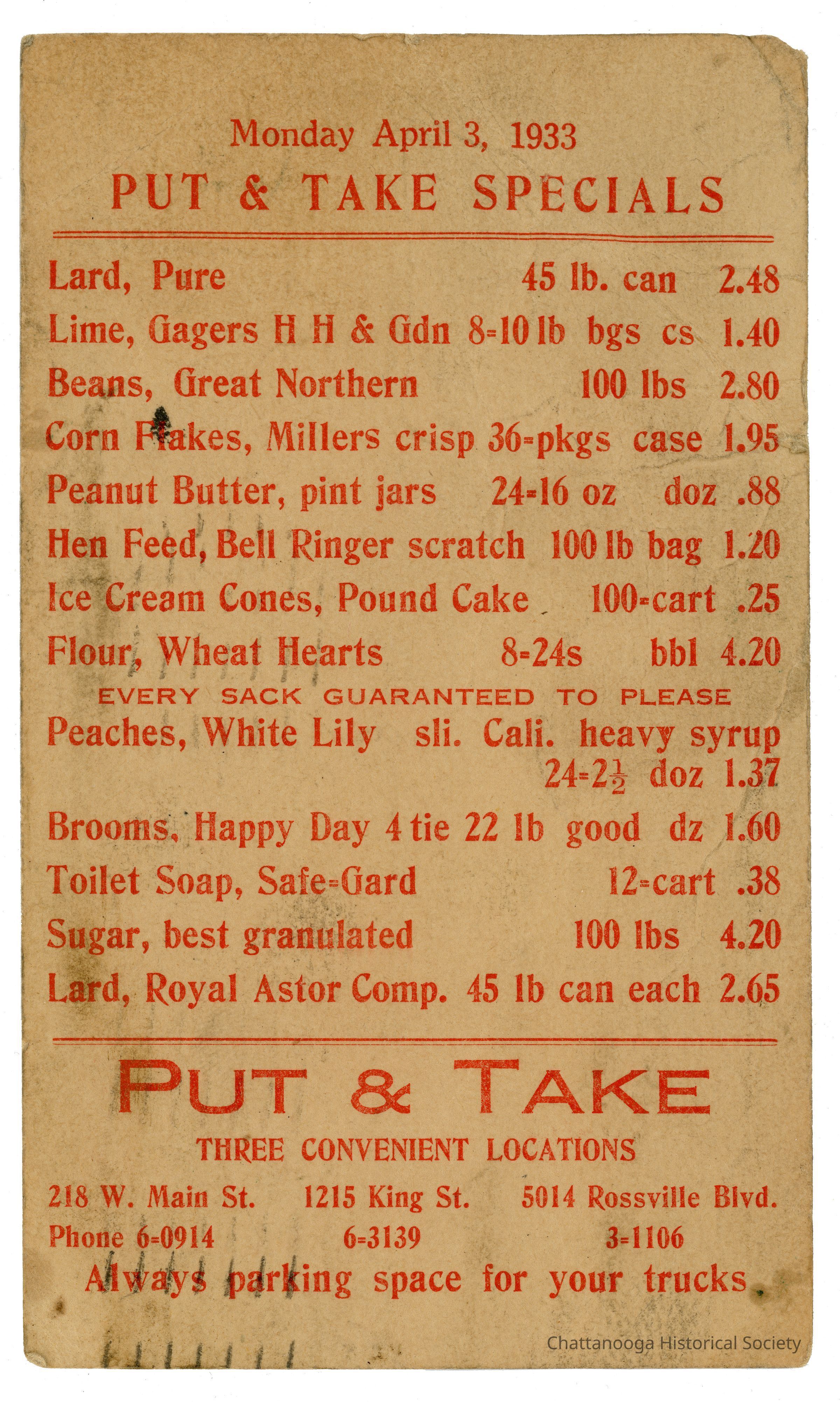 The Put and Take lists having three locations on the front: 218 W. Main St., 1215 King St., 5014 Rossville Blvd.