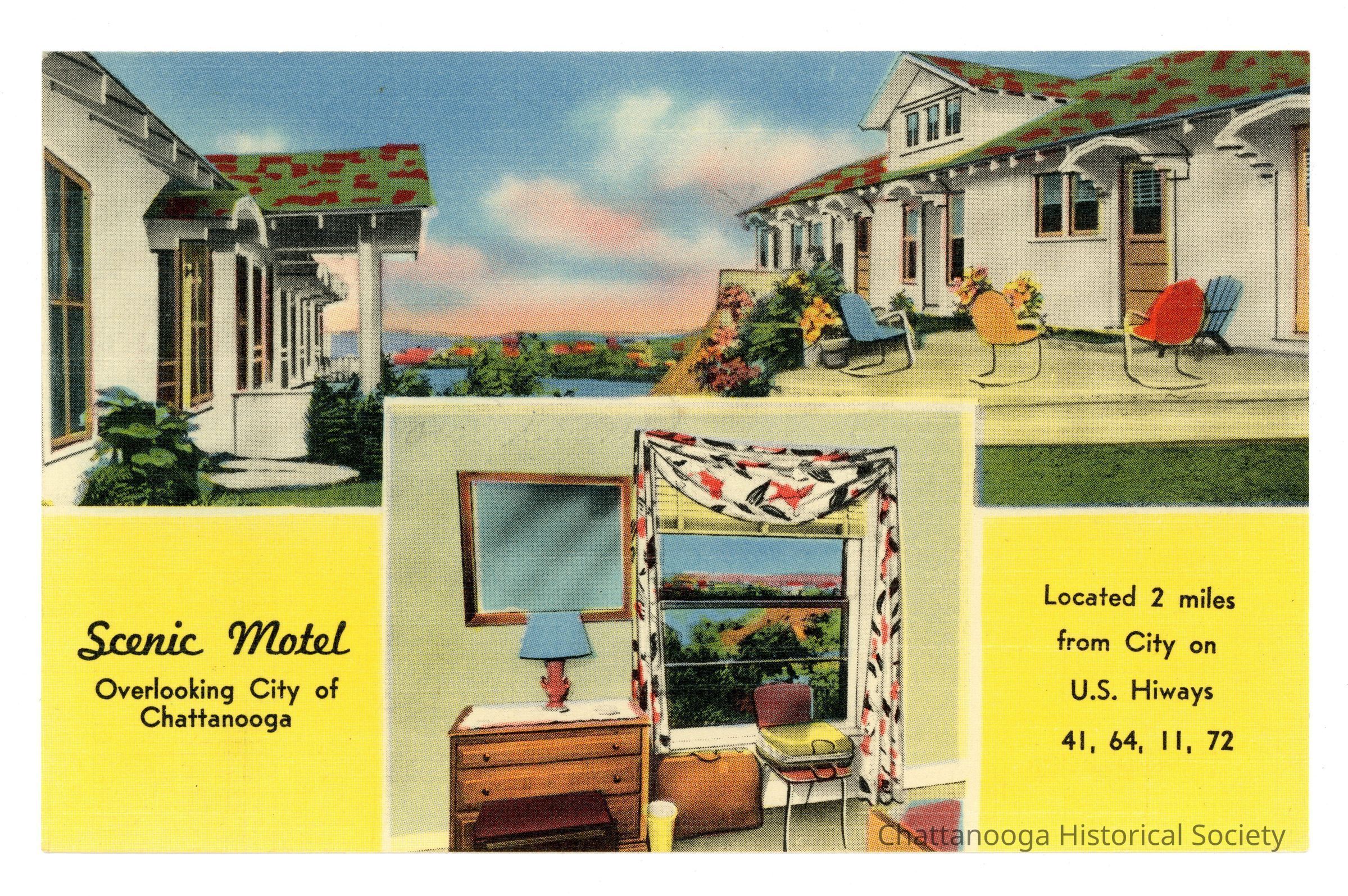 The Information blurb on the verso reads "Scenic Motel | AAA Approved - All electric heated - Modern new rooms- Private baths in every room - Located at Foot of Lookout Moun- | tain Southwest at City Limit on Highways 41, 64, 11, 72. | CHATTANOOGA, TENNESSEE | Mr. & Mrs. M. L.C. Smith, Owners & Operators | Phone Res. 5-2126"