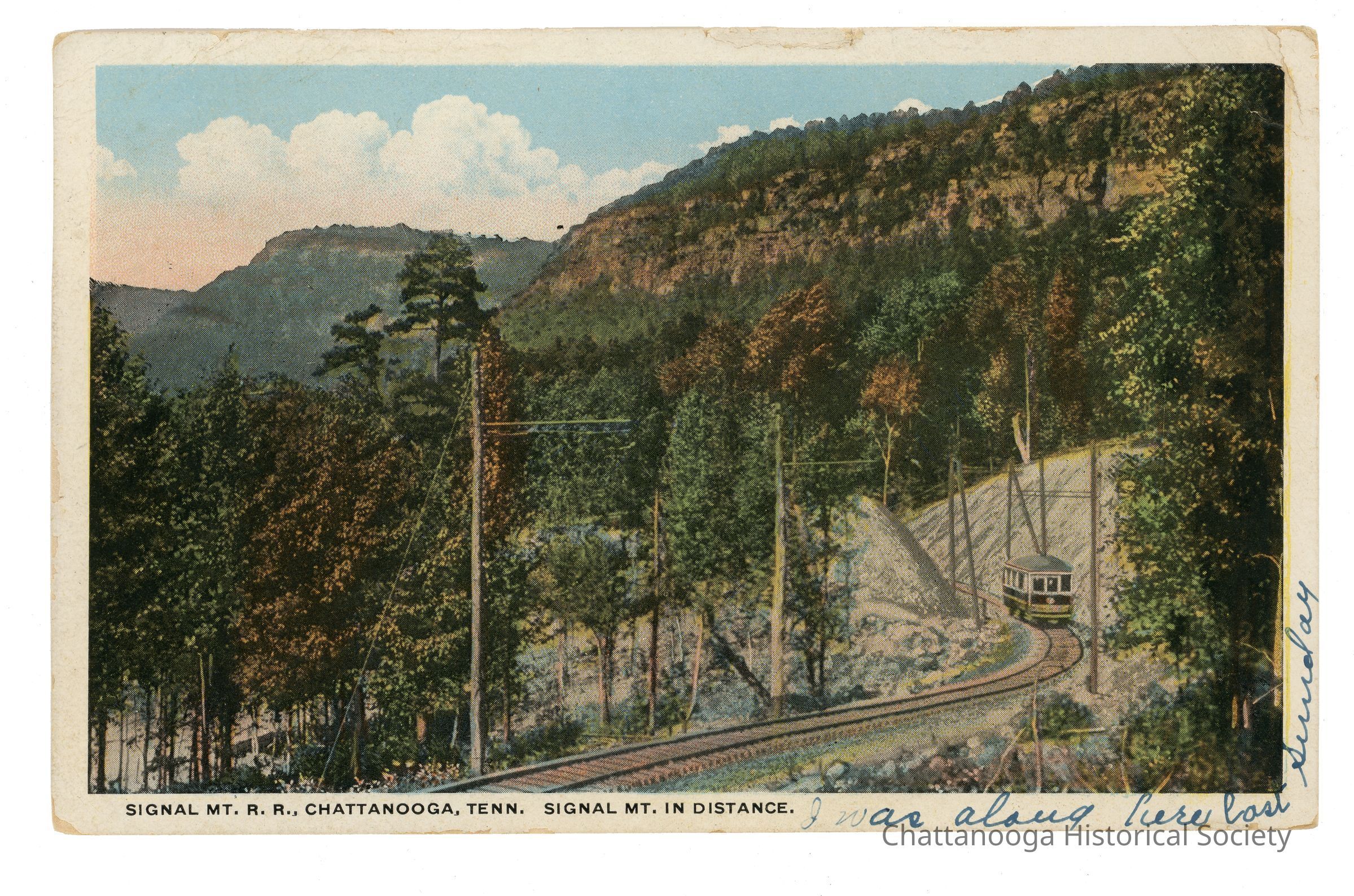A halftone postcard showing the Signal Mountain Railroad on the tracks at the base of Signal Mountain. The mountain rises in the background behind the train, with train passing. The electric lines that powered the car are seen on both sides of the tracks. The postcard is titled "Signal Mt. R.R., Chattanooga, Tenn. Signal Mt. in Distance" with "I was along here last Sunday" written in blue ink beside it.