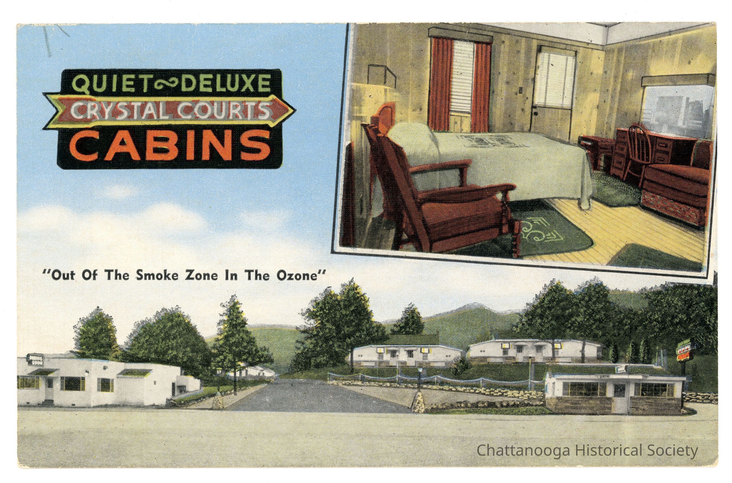 Halftone postcard advertising the Crystal Courts Cabins on Cummings Highway. The postcard features a colored image of the motor court cabins, with an office in the foreground. An inset image shows the cabin's interior. "Out of the Smoke Zone in the Ozone" is printed at center, left.