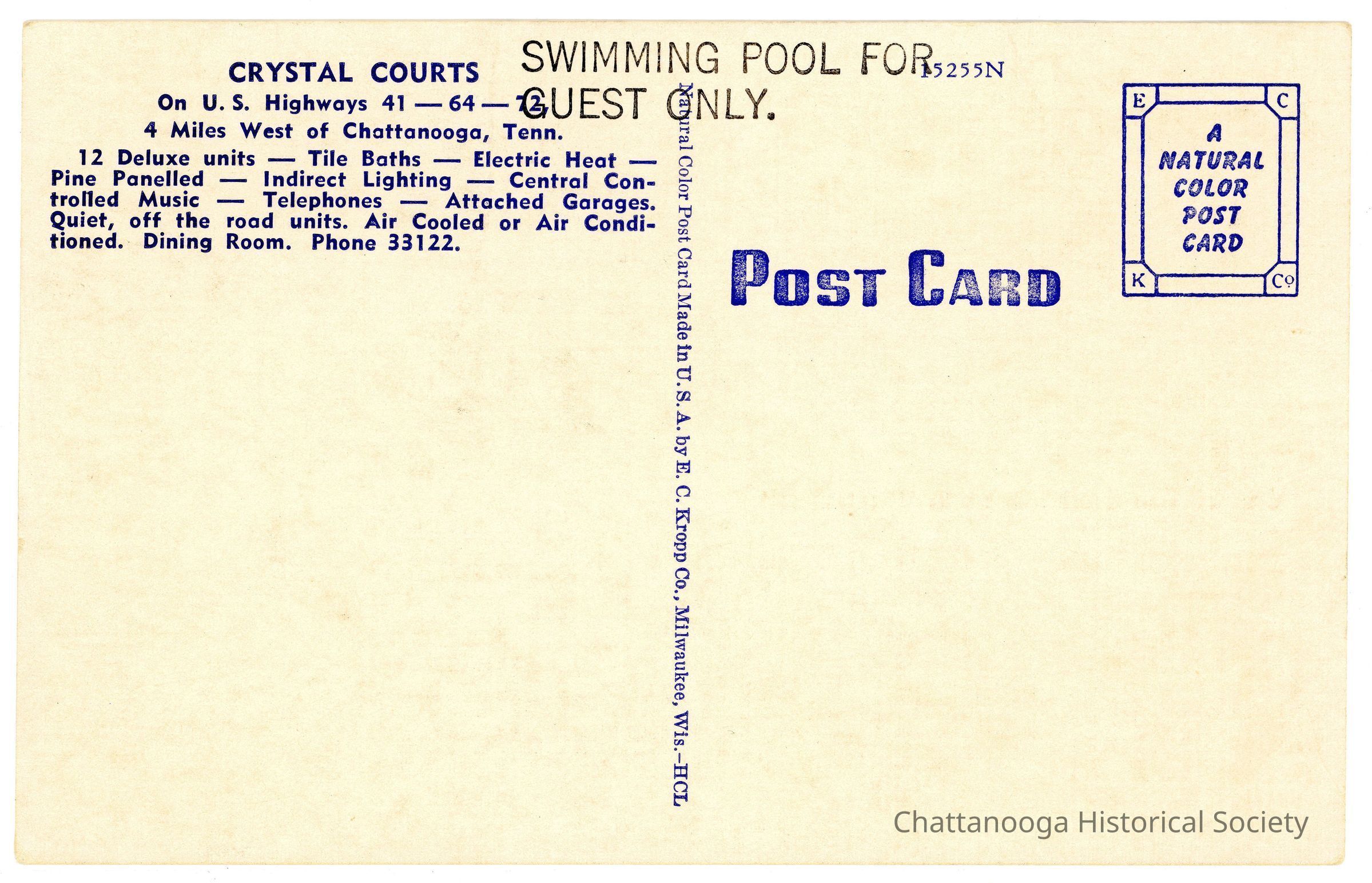 The verso is stamped "Swimming Pool For | Guest Only" at top, center. The information blurb on the verso reads "Crystal Courts | On U.S. Highways 41-64-72 | 4 Miles West of Chattanooga, Tenn. | 12 Deluxe Units - Tile Baths - Electric Heat - | Pine Panelled - Indirect Lighting - Central Con- | trolled Music - Telephones - Attached Garages. | Quiet, off the road units. Air Cooled or Air Condi- | tioned. Dining Room. Phone 33122."